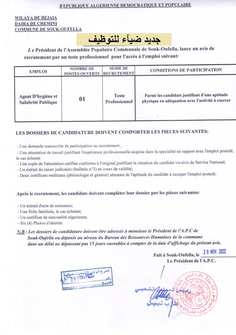اعلان عن توظيف ببلدية اوفلة بولاية بجاية