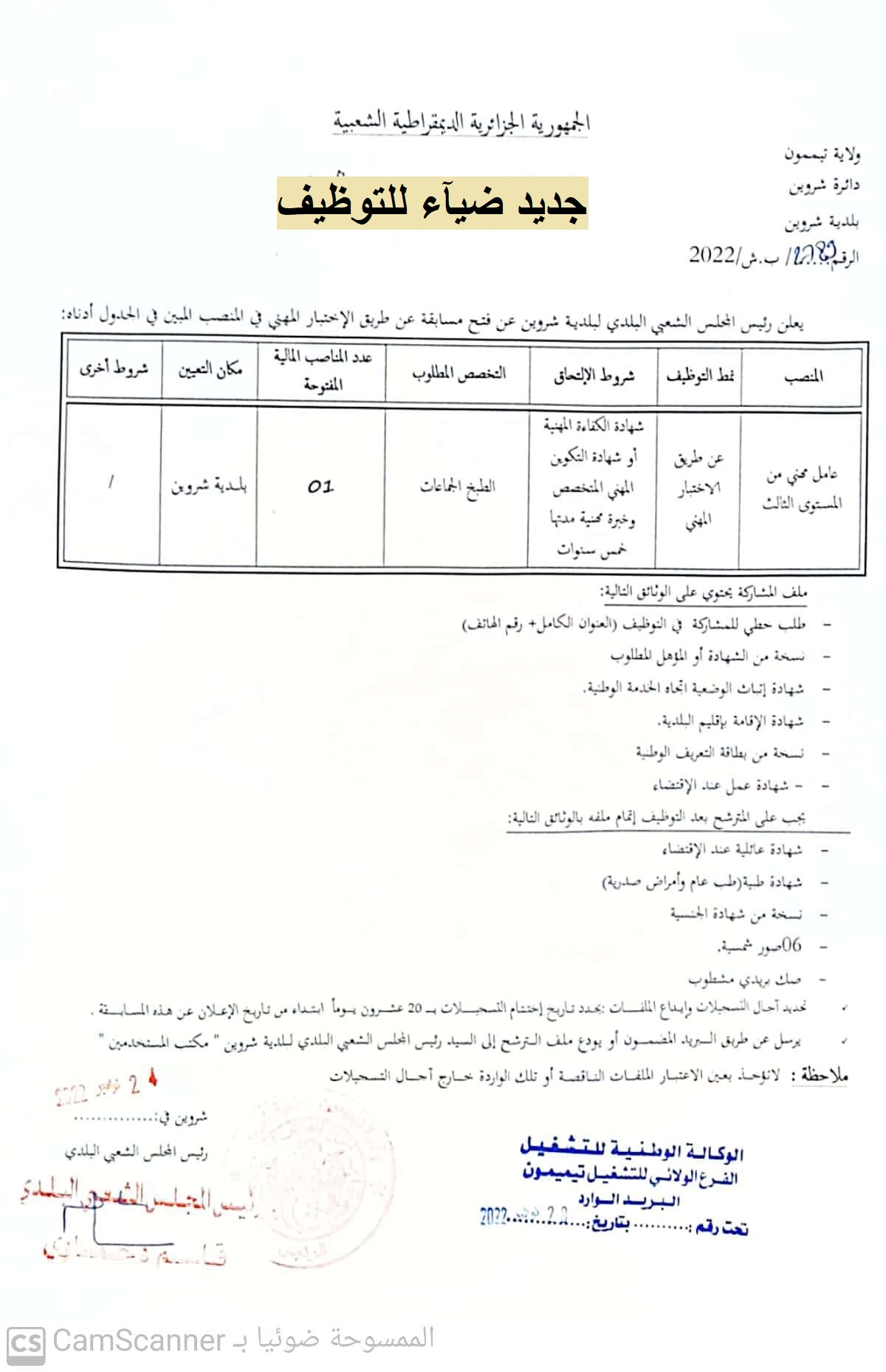 اعلان عن توظيف ببلدية شروين بولاية تيميمون