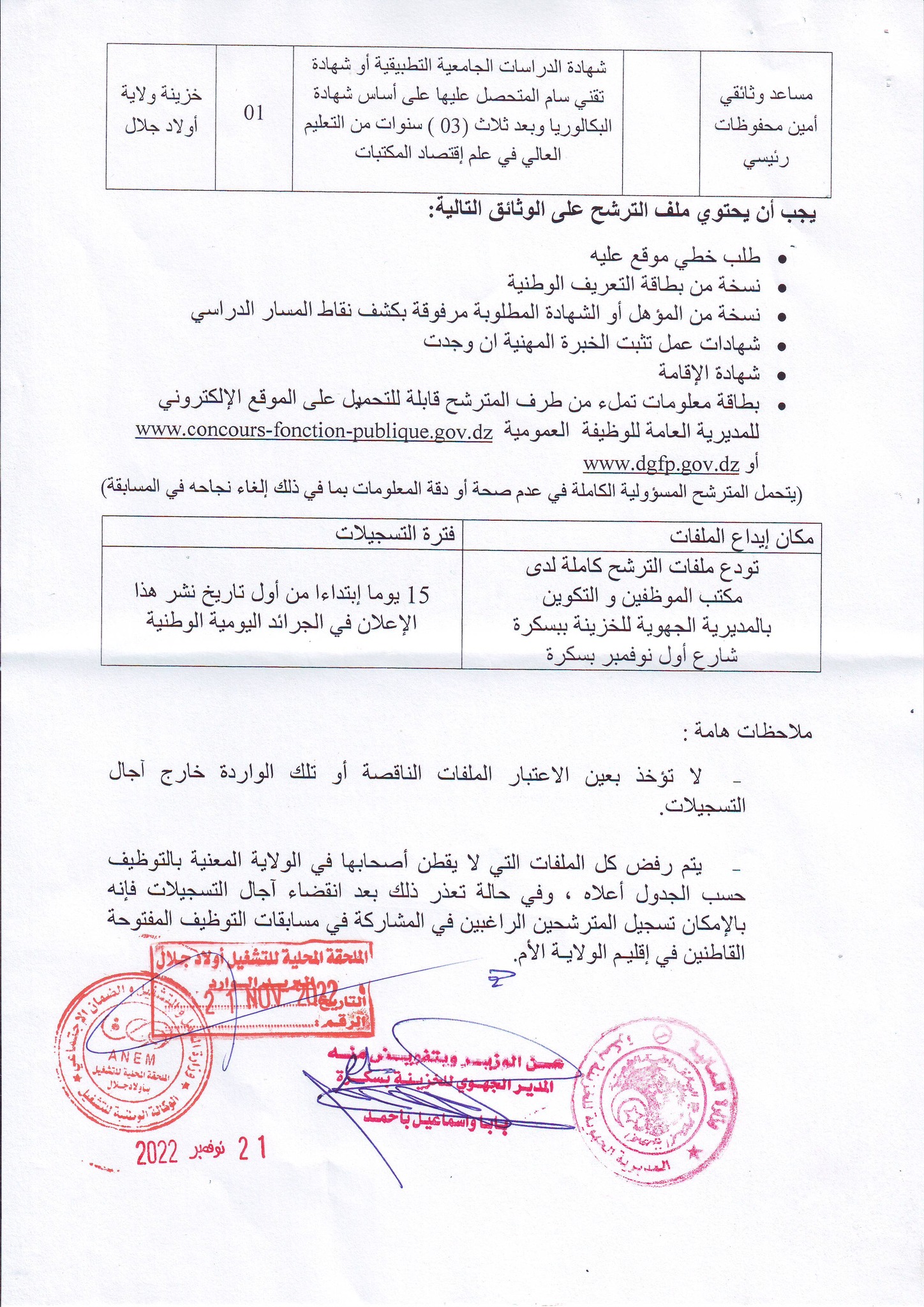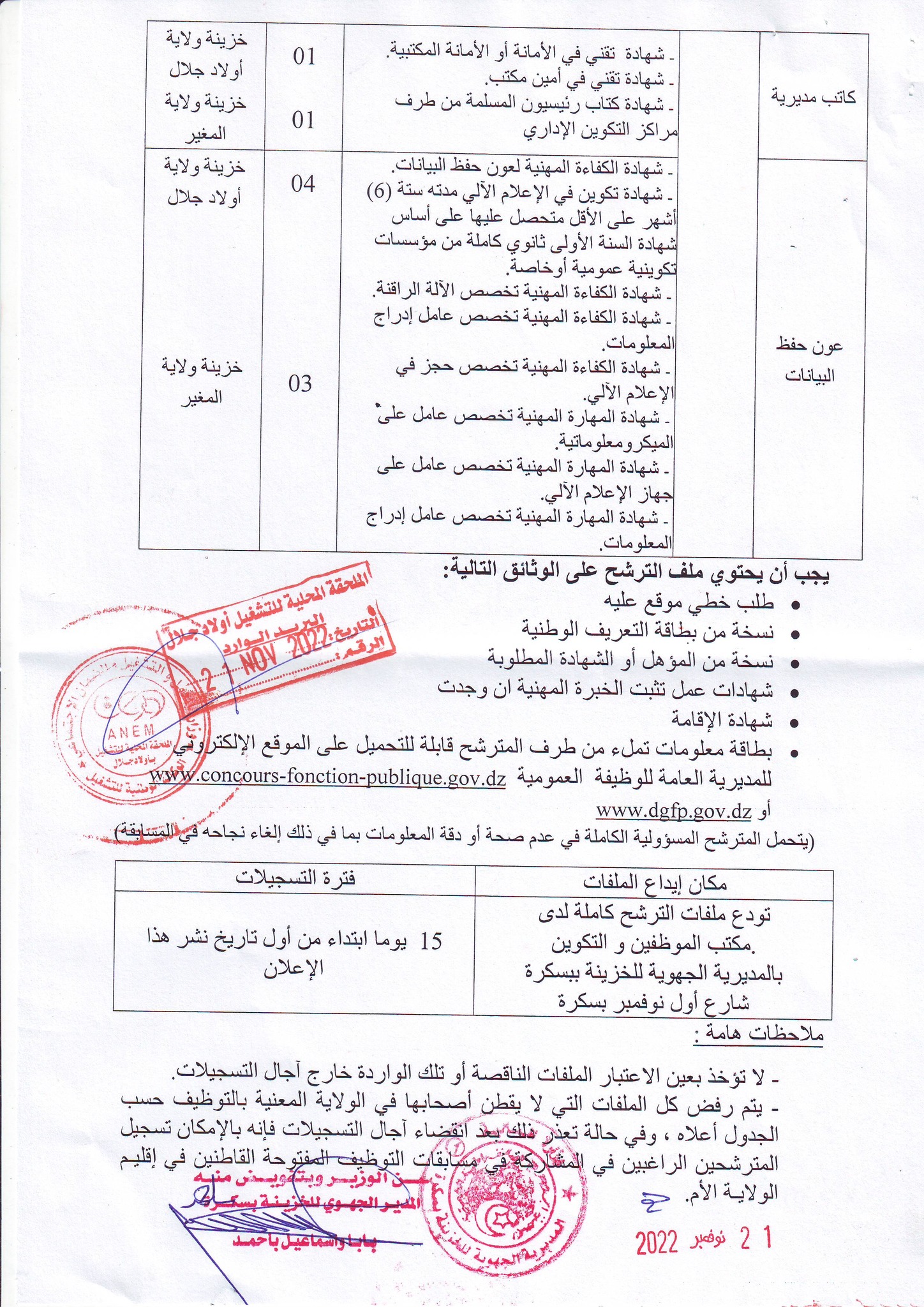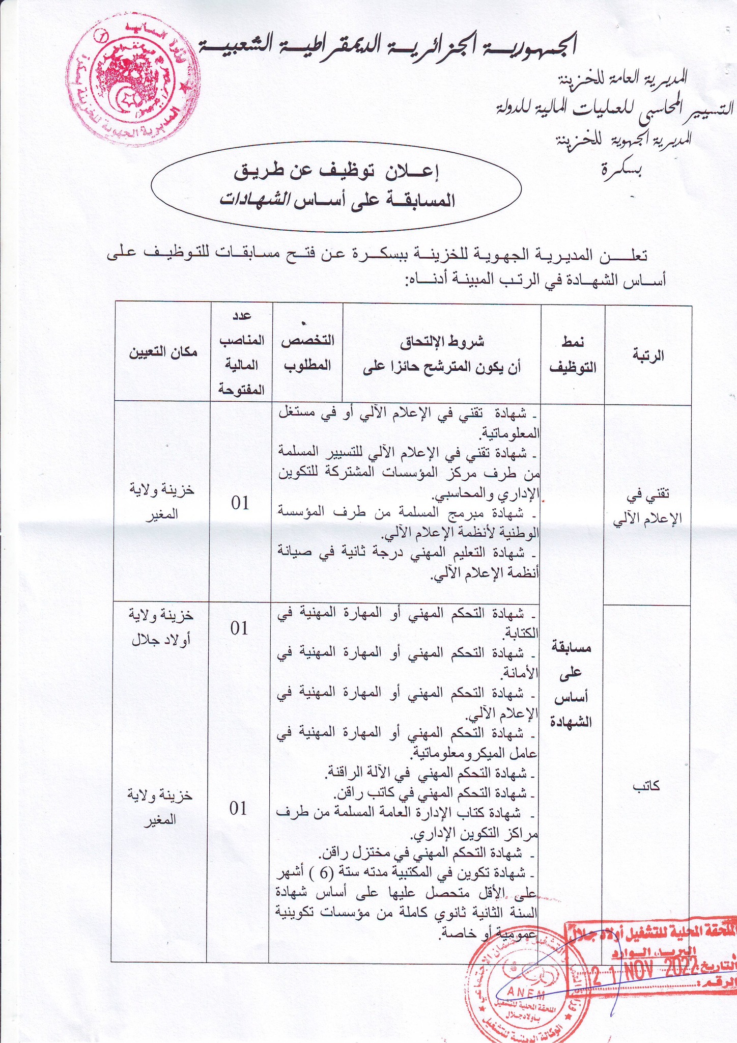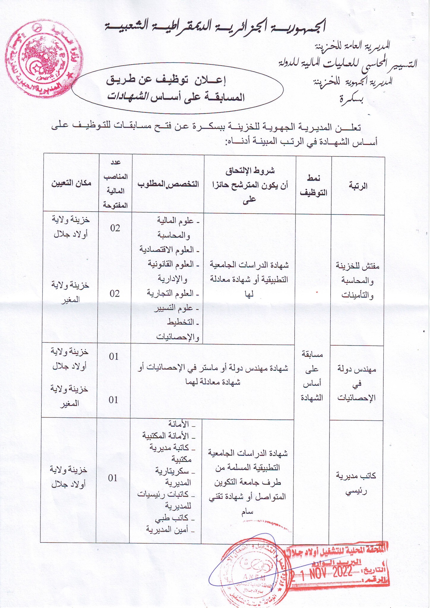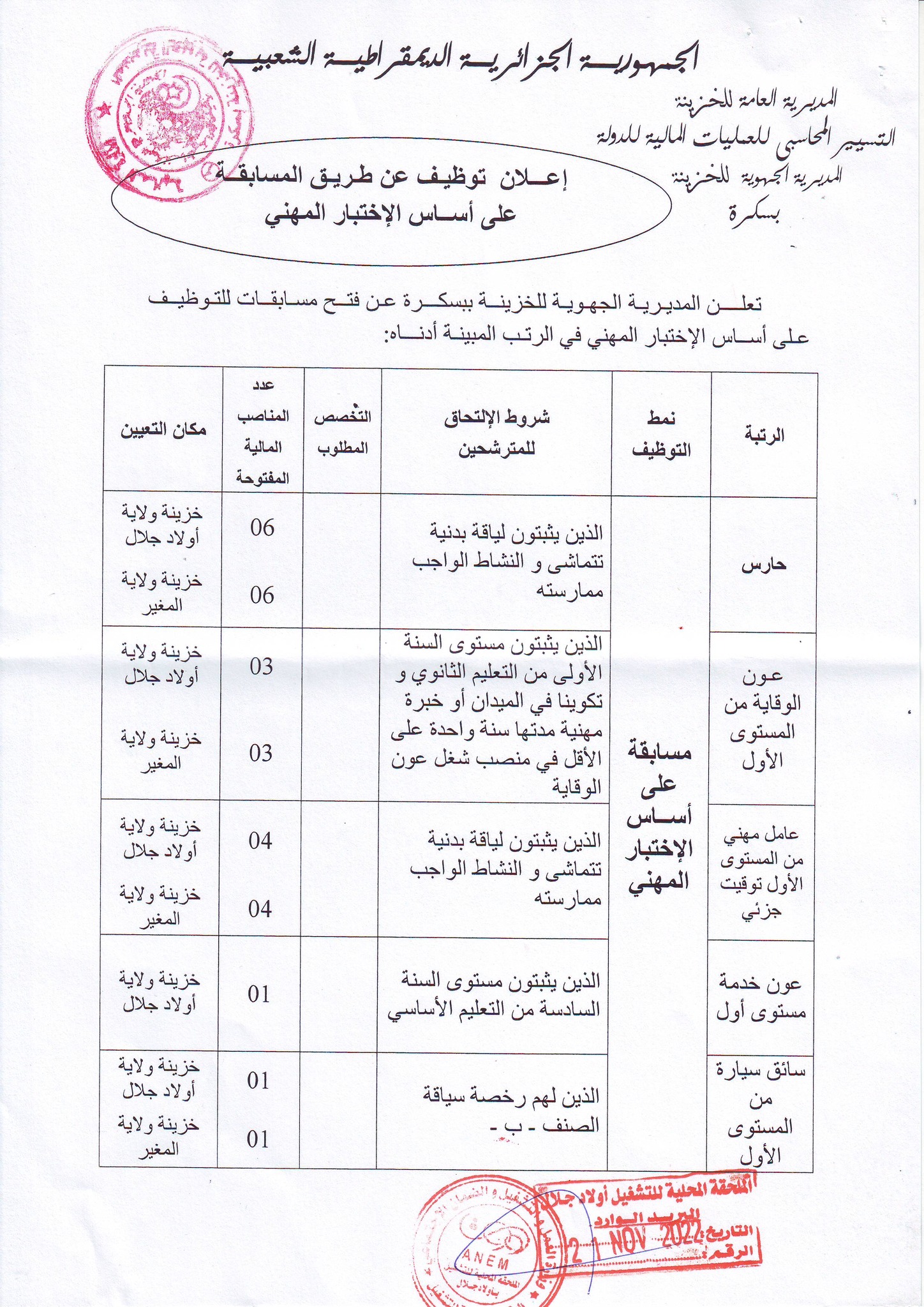 اعلان عن توظيف بالمديرية الجهوية للخزينة لولاية بسكرة لفائدة الخزينة الولائية لكل من ولاية أولاد جلال والمغير