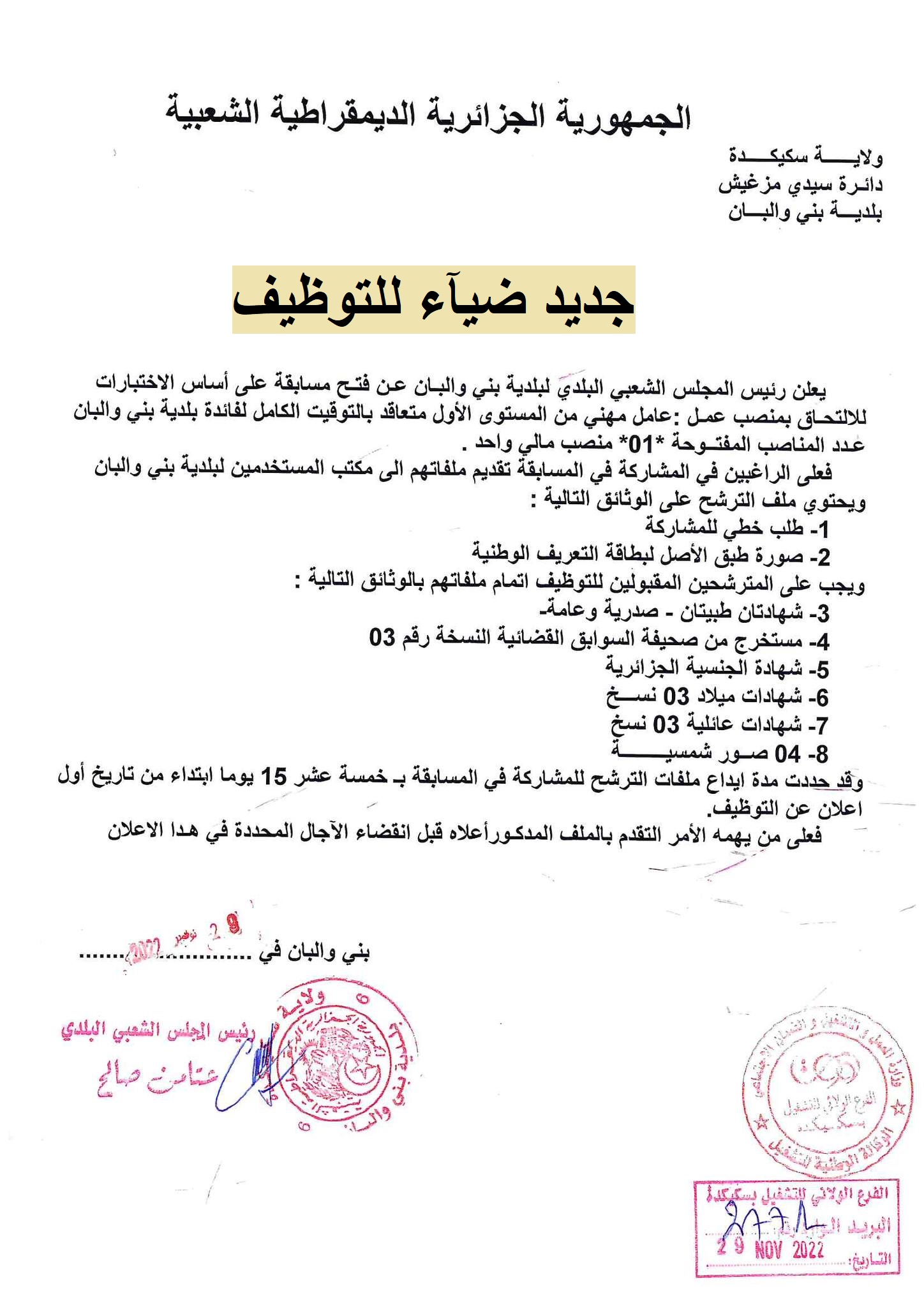 اعلان عن توظيف ببلدية بني والبان بولاية سكيكدة