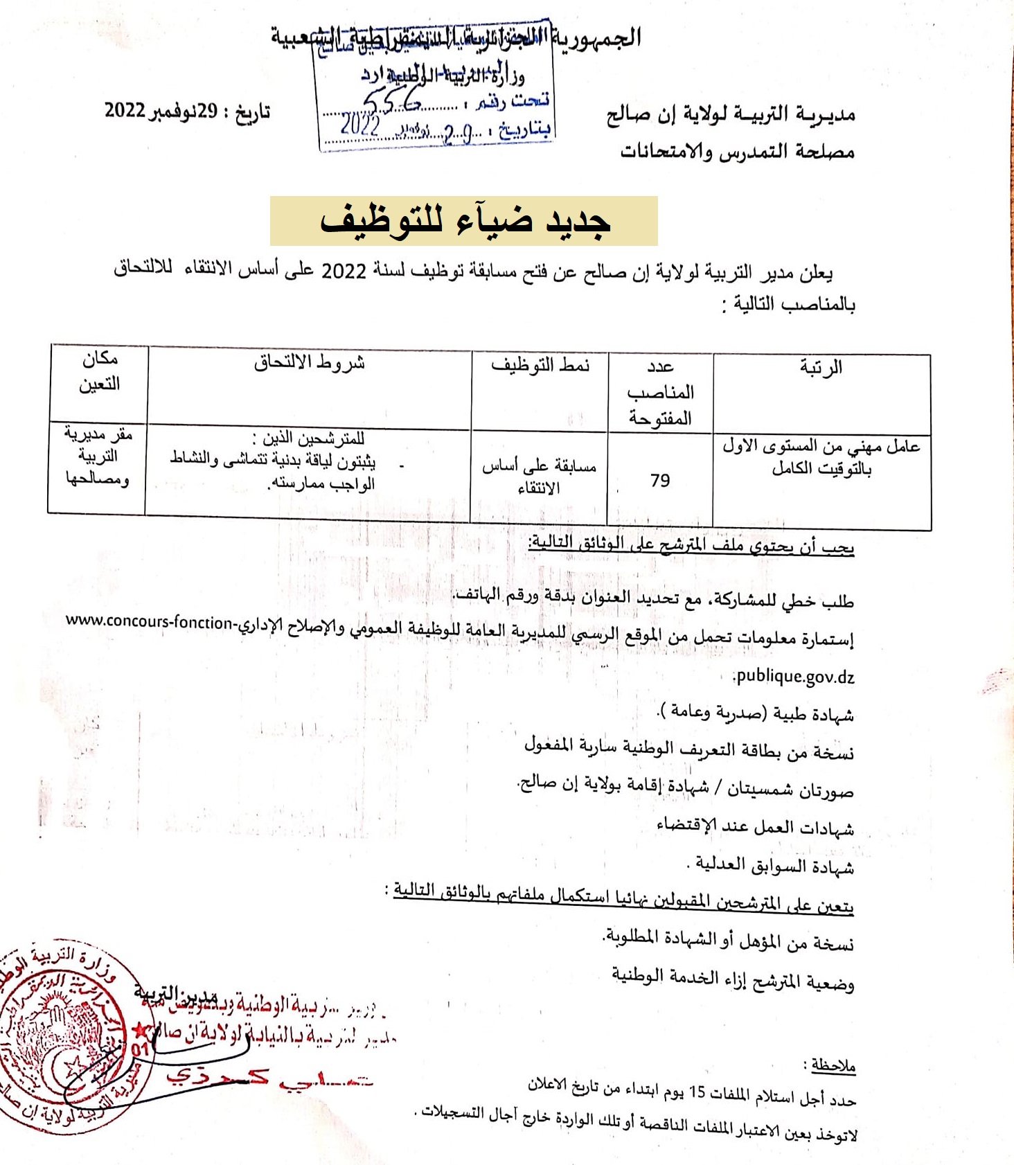 اعلان عن توظيف بمديرية التربية لولاية عين صالح
