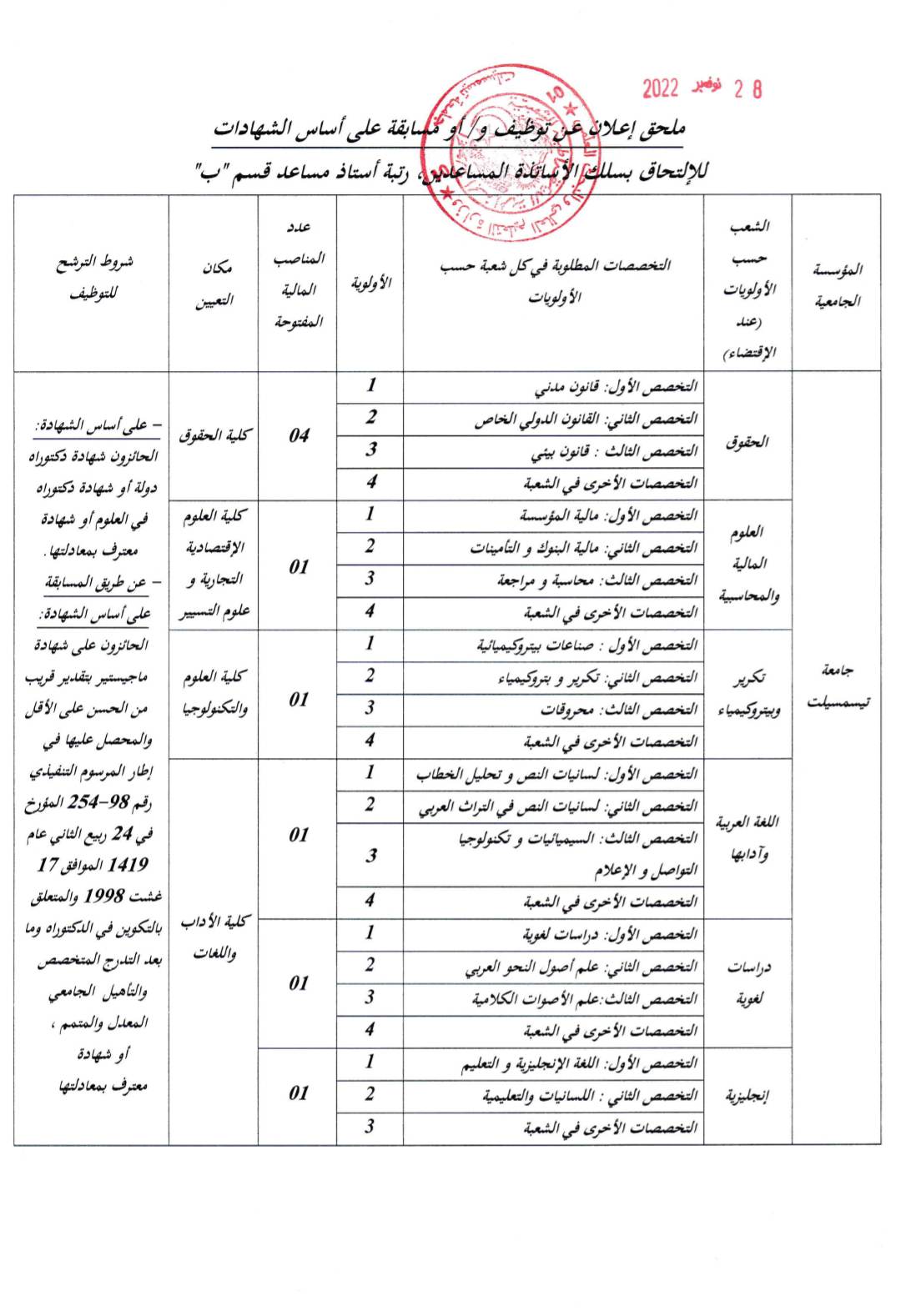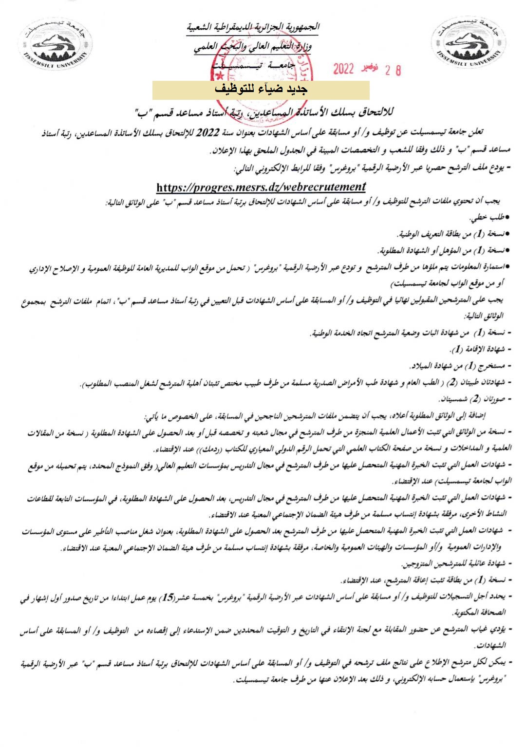 تعلن جامعة تيسمسيلت عن فتح مسابقة على أساس الشهادة للتوظيف في الرتب المبينة أدناه: