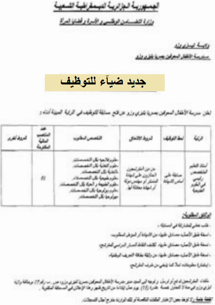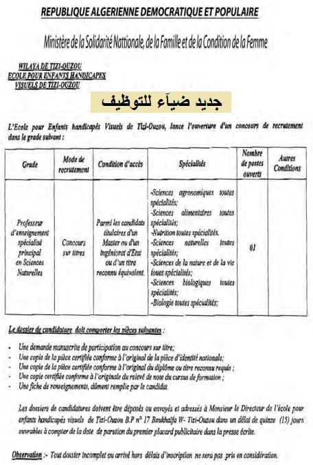 تعلن مدرسة الأطفال المعوقين بصريا بولاية تيزي وزو عن فتح مسابقة على أساس الشهادة للتوظيف في الرتب المبينة أدناه: