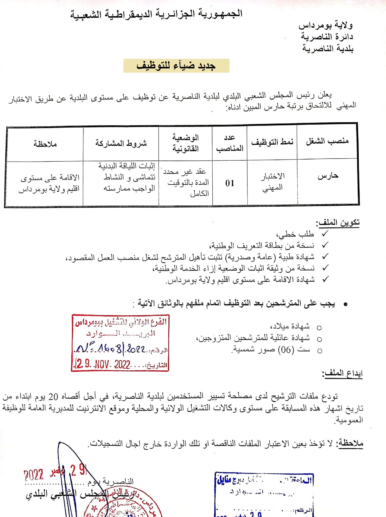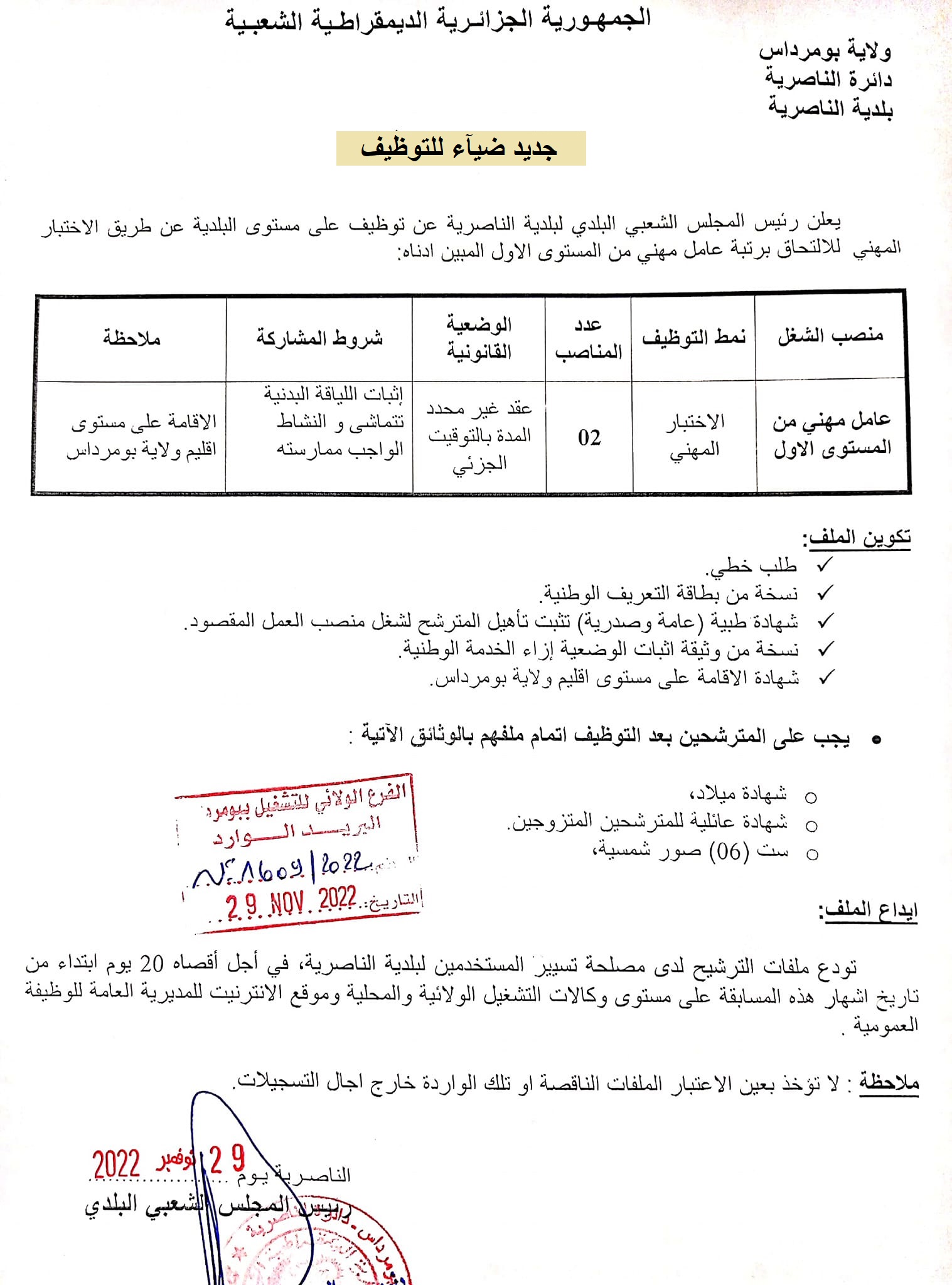 اعلان عن توظيف ببلدية الناصرية بولاية بومرداس