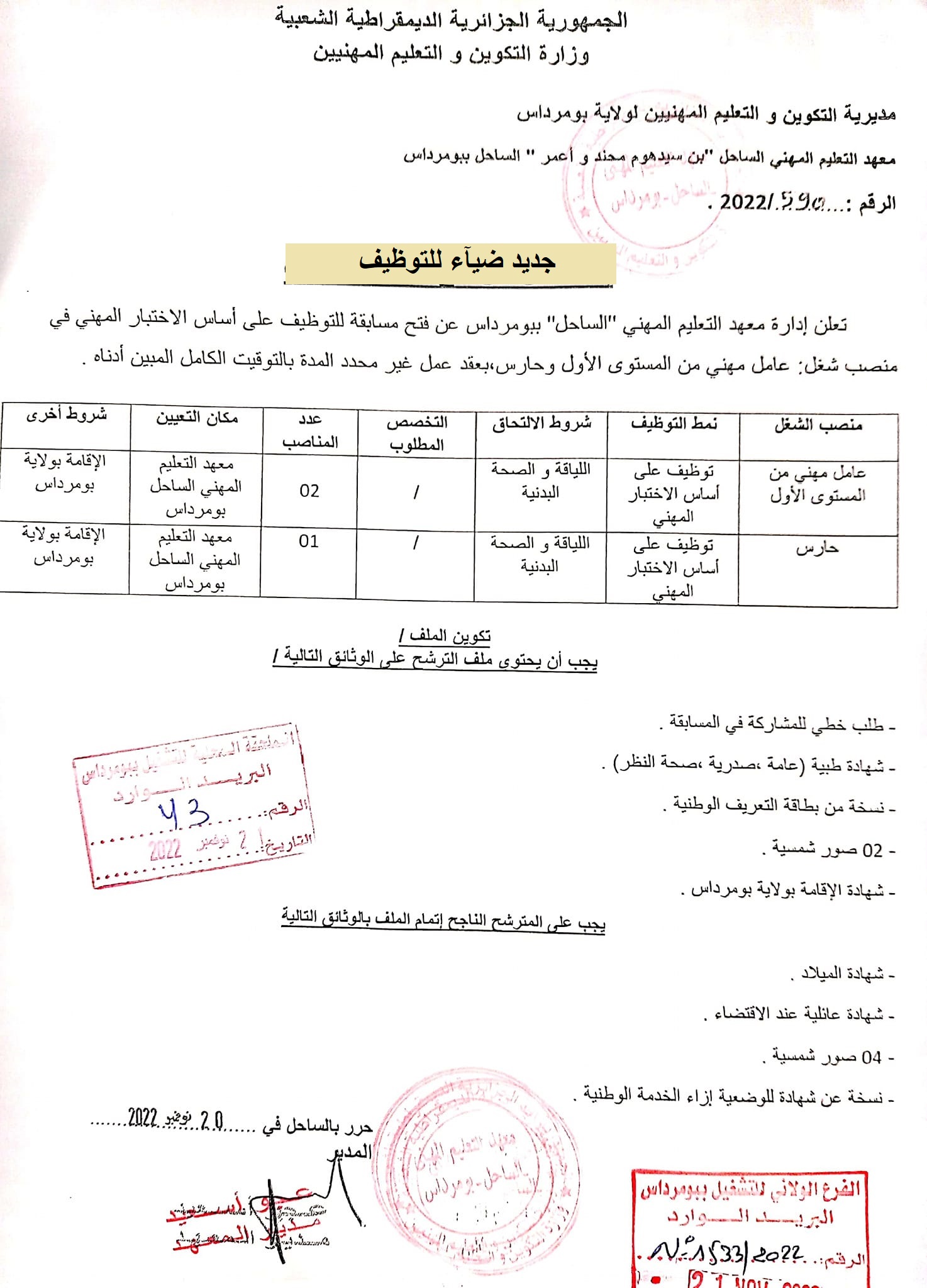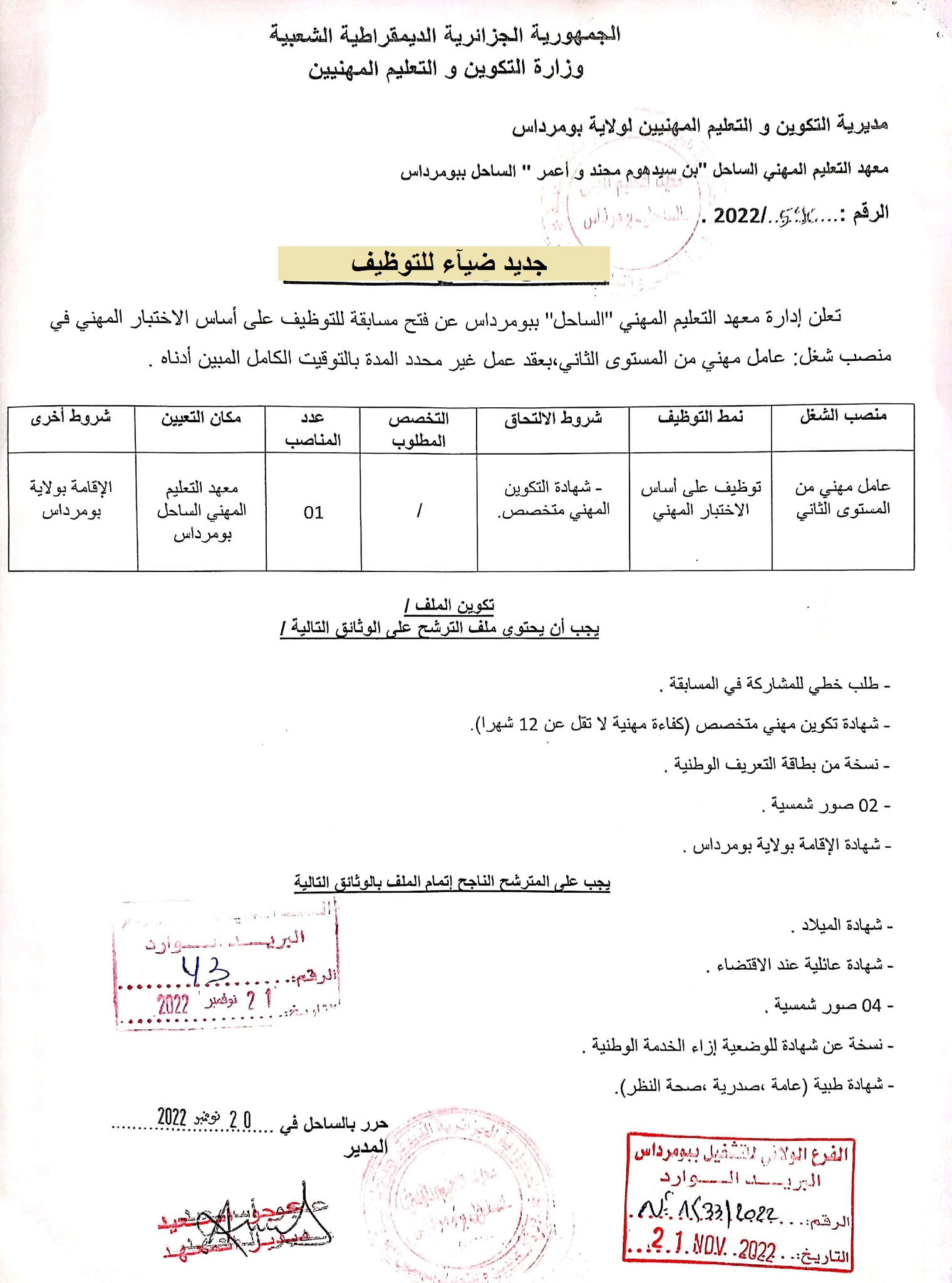 | اعلان عن توظيف بمعهد التعليم المهني بالساحل بولاية بومرداس |