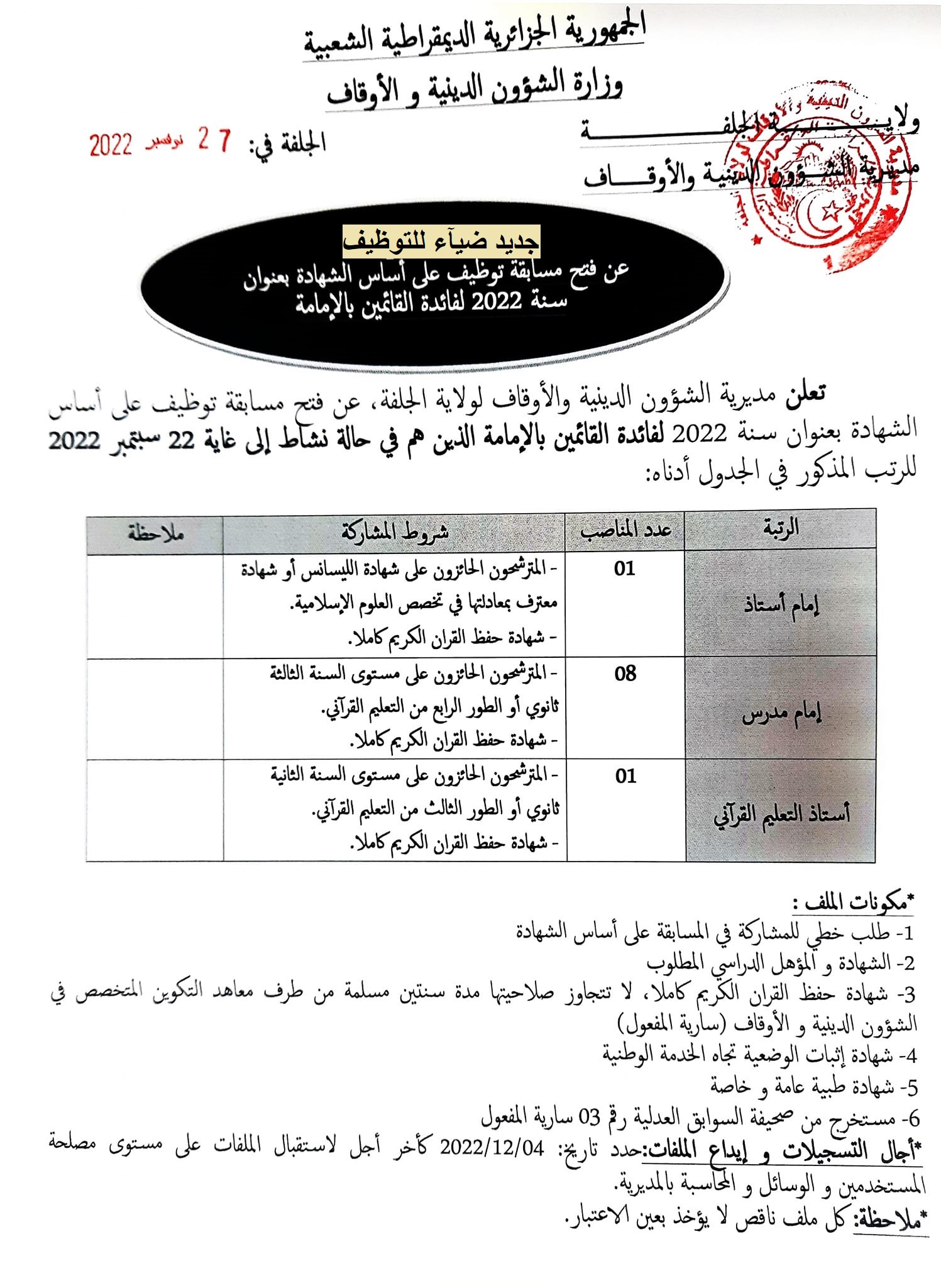 اعلان عن توظيف بمديرية الشؤون الدينية والاوقاف بولاية الجلفة