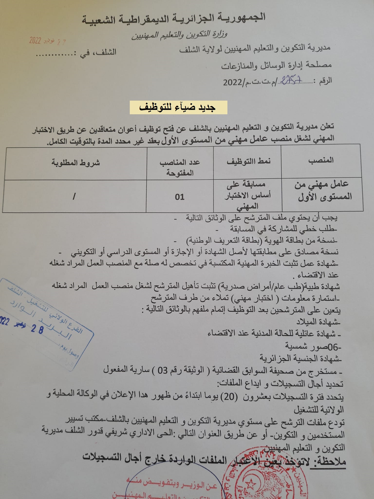 اعلان عن توظيف بمديرية التكوين والتعليم المهنيين لولاية الشلف