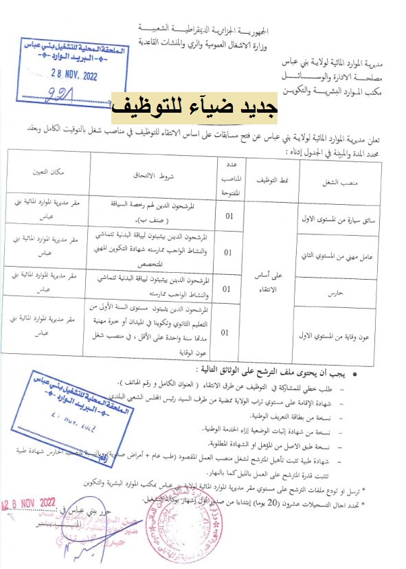 اعلان عن توظيف بمديرية الموارد المائية لولاية بني عباس