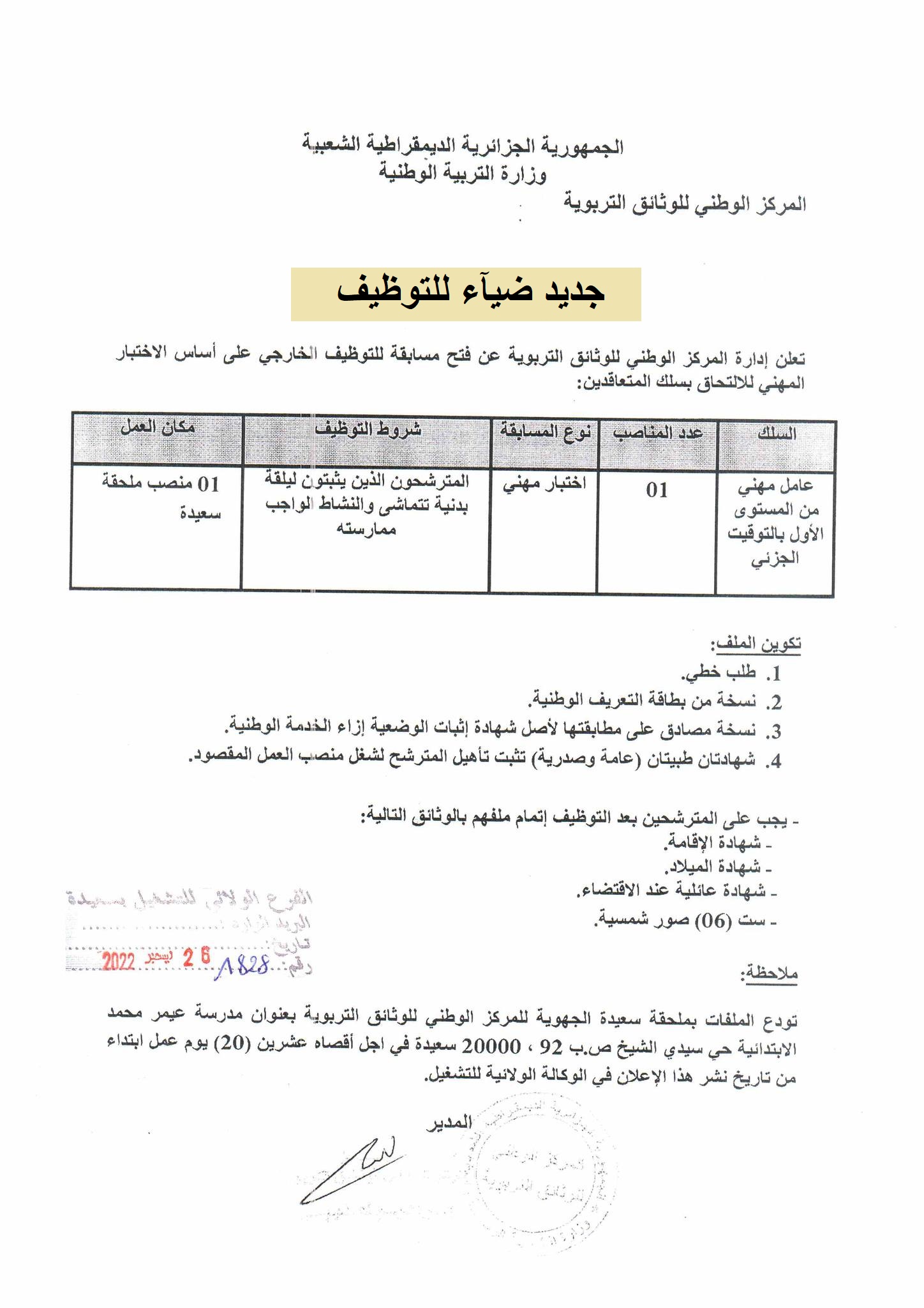 اعلان عن توظيف بالمركز الوطني للوثائق التربوية بولاية سعيدة