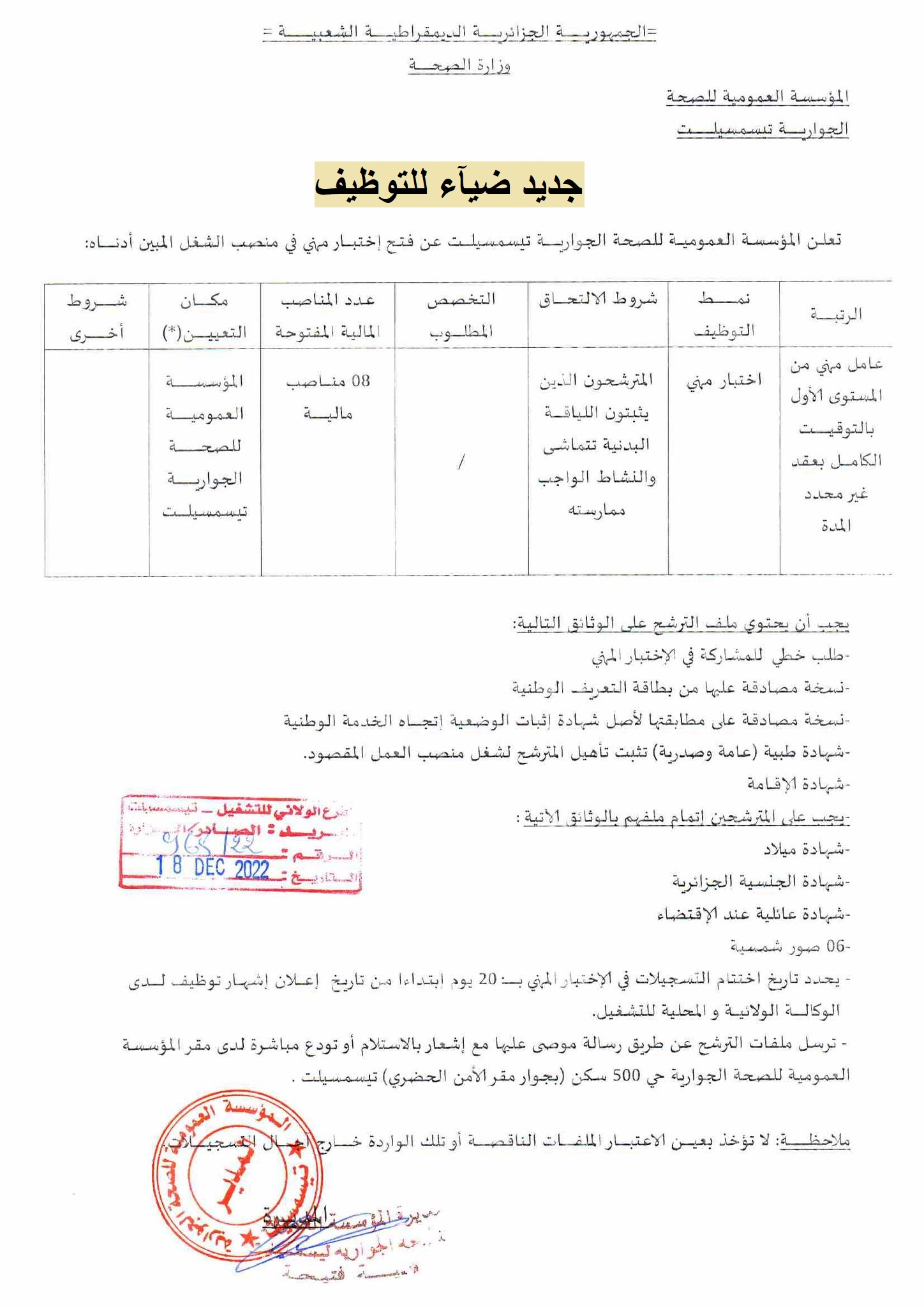 اعلان عن توظيف بالمؤسسة العمومية للصحة الجوارية بولاية تيسمسيلت