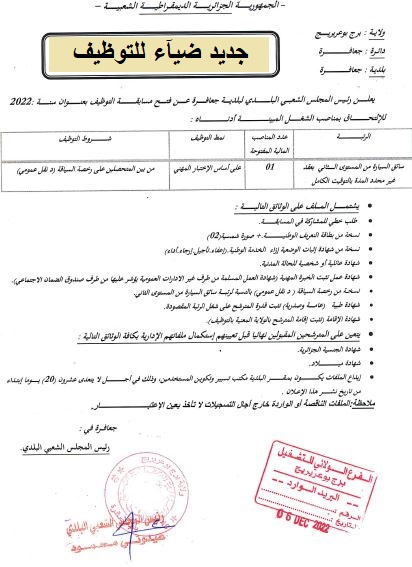 اعلان عن توظيف ببلدية الجعافرة بولاية برج بوعريريج