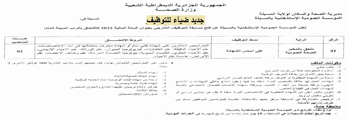 اعلان عن توظيف بالمؤسسة العمومية الاستشفائية بولاية المسيلة