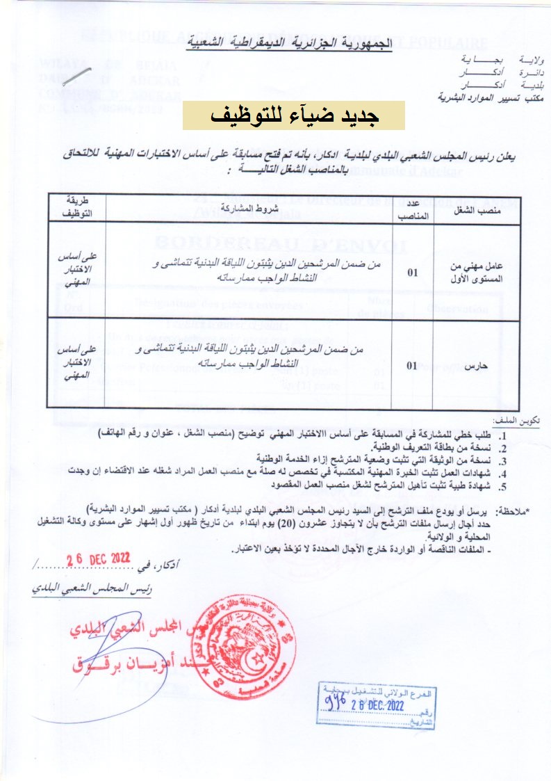 اعلان عن توظيف ببلدية ادكار بولاية بجاية