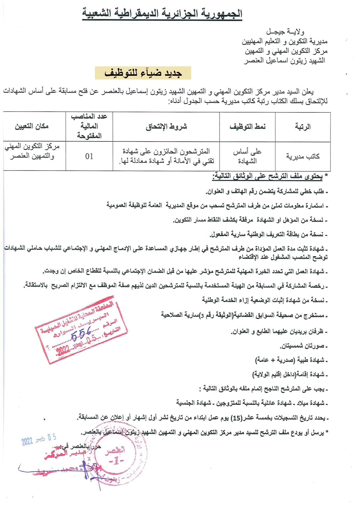 يعلن مركز التكوين المهني والتمهين الشهيد زيتون إسماعيل بالعنصر بولاية جيجل عن فتح مسابقة على أساس الشهادة للتوظيف في الرتب المبينة أدناه:
