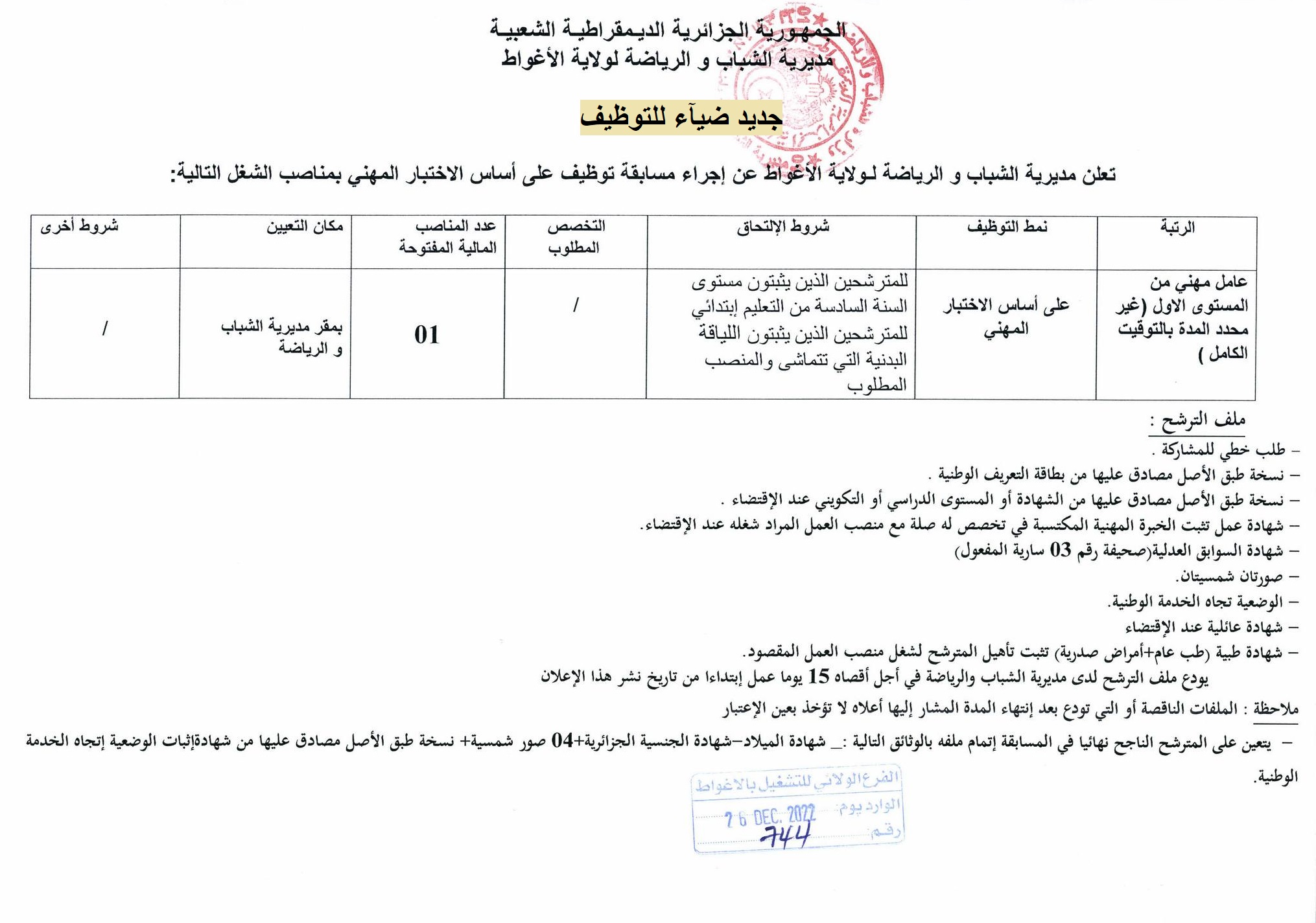اعلان عن توظيف بمديرية الشباب والرياضة لولاية الاغواط