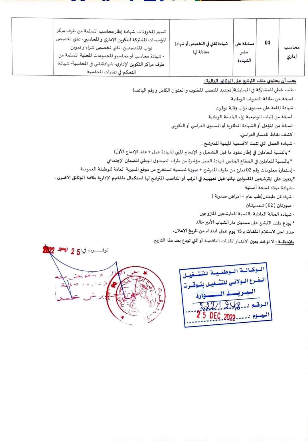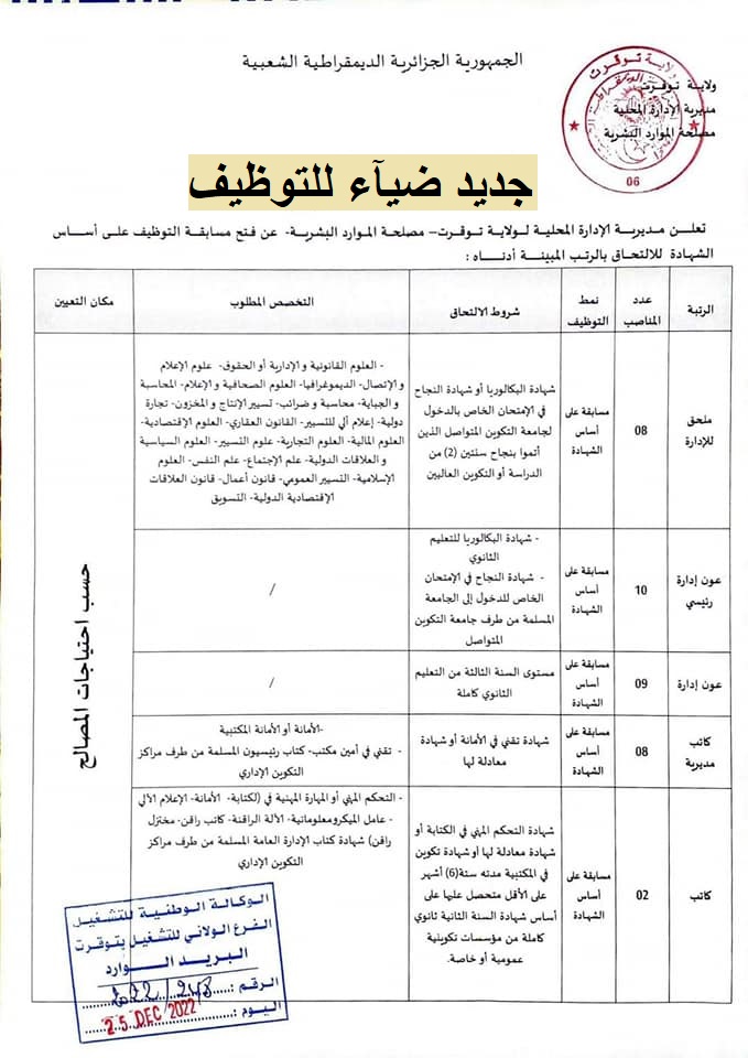 تعلن مديرية الإدارة المحلية لولاية توقرت عن فتح مسابقة على أساس الشهادة للتوظيف في الرتب المبينة أدناه: