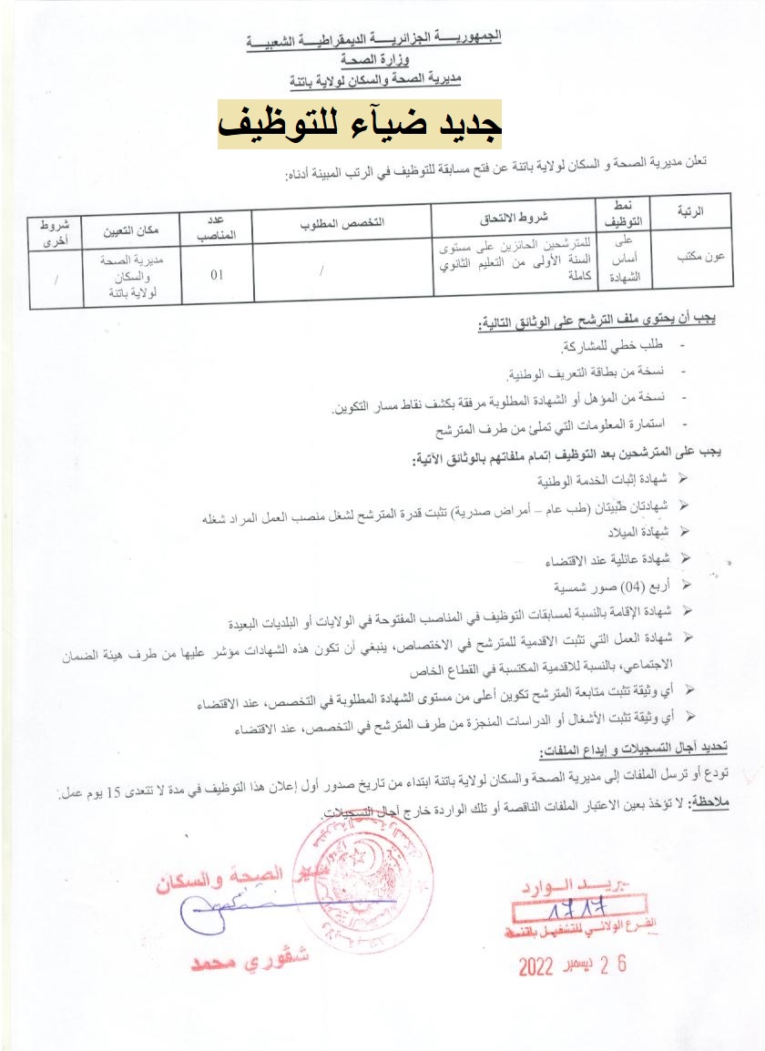 اعلان عن توظيف بمديرية الصحة والسكان لولاية باتنة