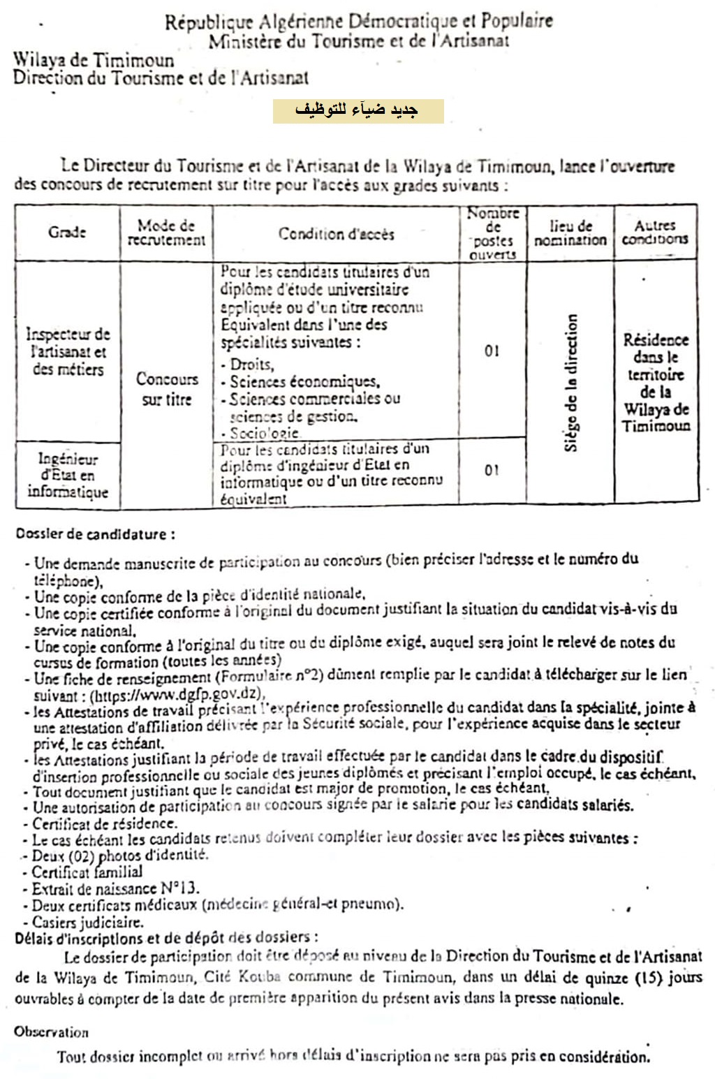 تعلن مديرية السياحة والصناعة التقليدية لولاية تيميمون عن فتح مسابقة على أساس الشهادة للتوظيف في الرتب المبينة أدناه: