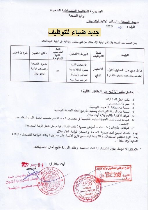 اعلان عن توظيف بمديرية الصحة والسكان لولاية أولاد جلال