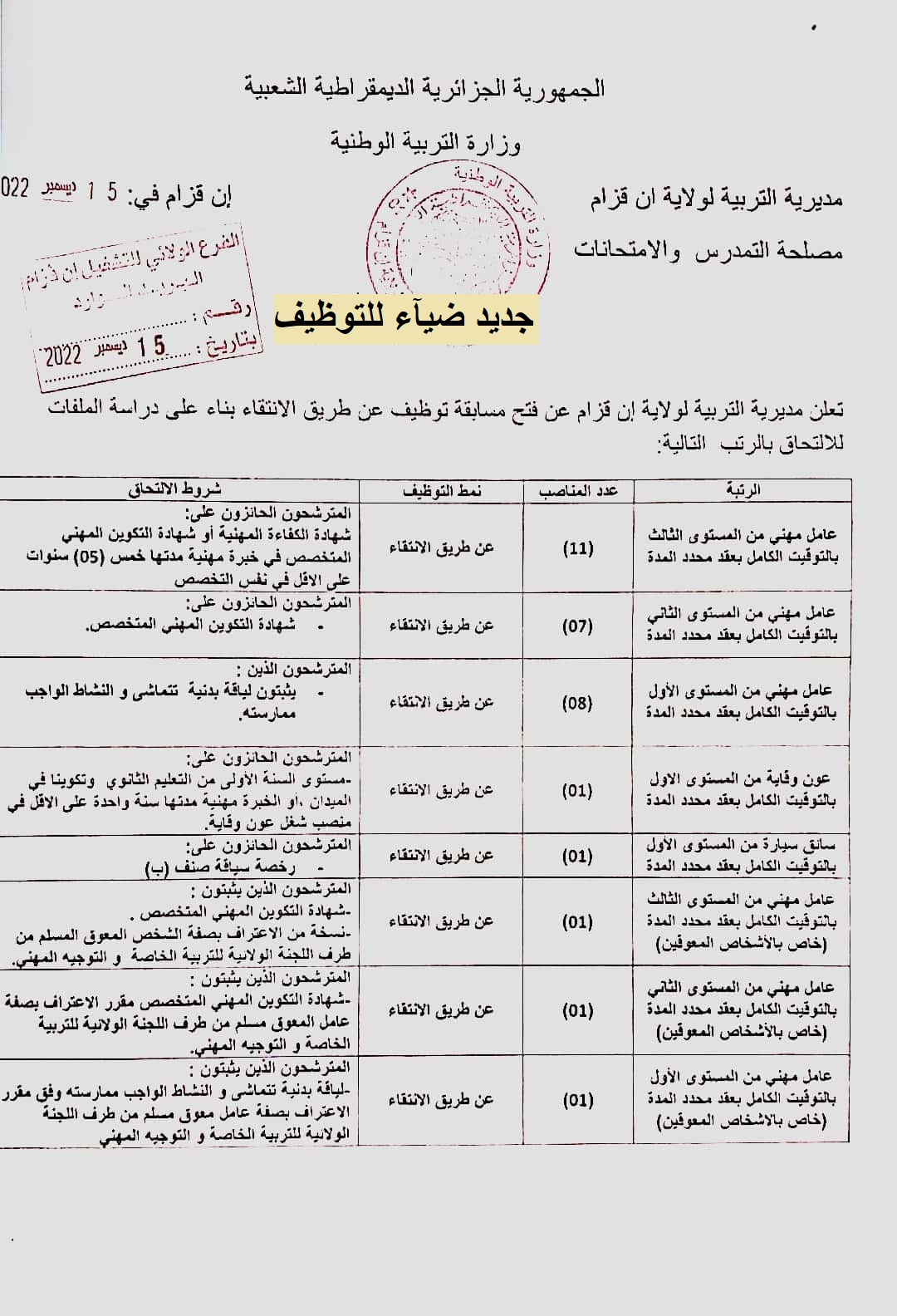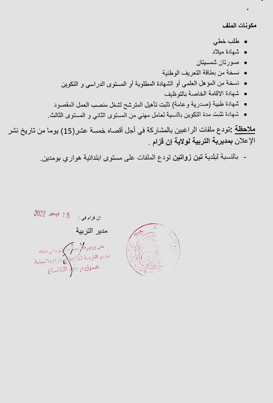 اعلان عن توظيف بمديرية التربية لولاية عين قزام