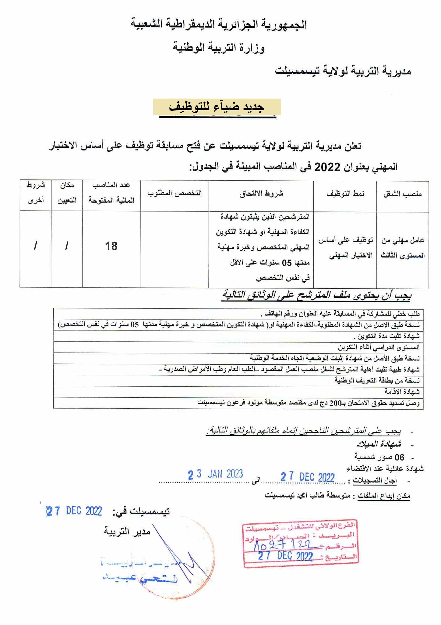 اعلان توظيف بولاية تيسمسيلت