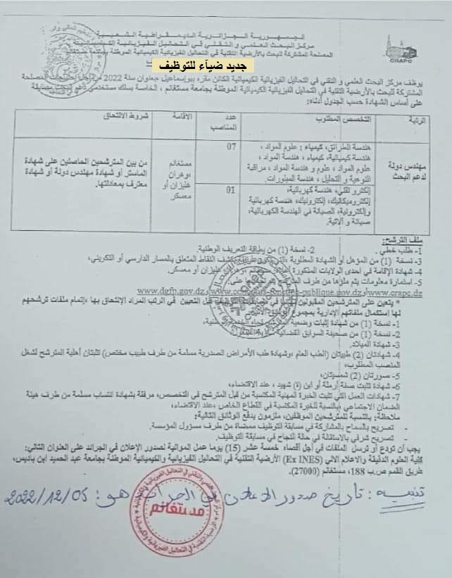 | إعلان عن توظيف بمركز البحث العلمي والتقني للتحاليل الفيزيائية والكيميائية بولاية مستغانم |