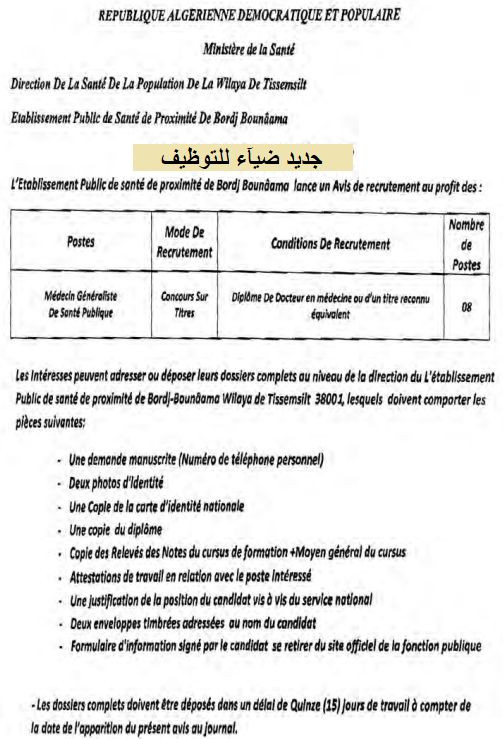 اعلان عن توظيف بالمؤسسة العمومية للصحة الجوارية برج بونعامة بولاية تيسمسيلت