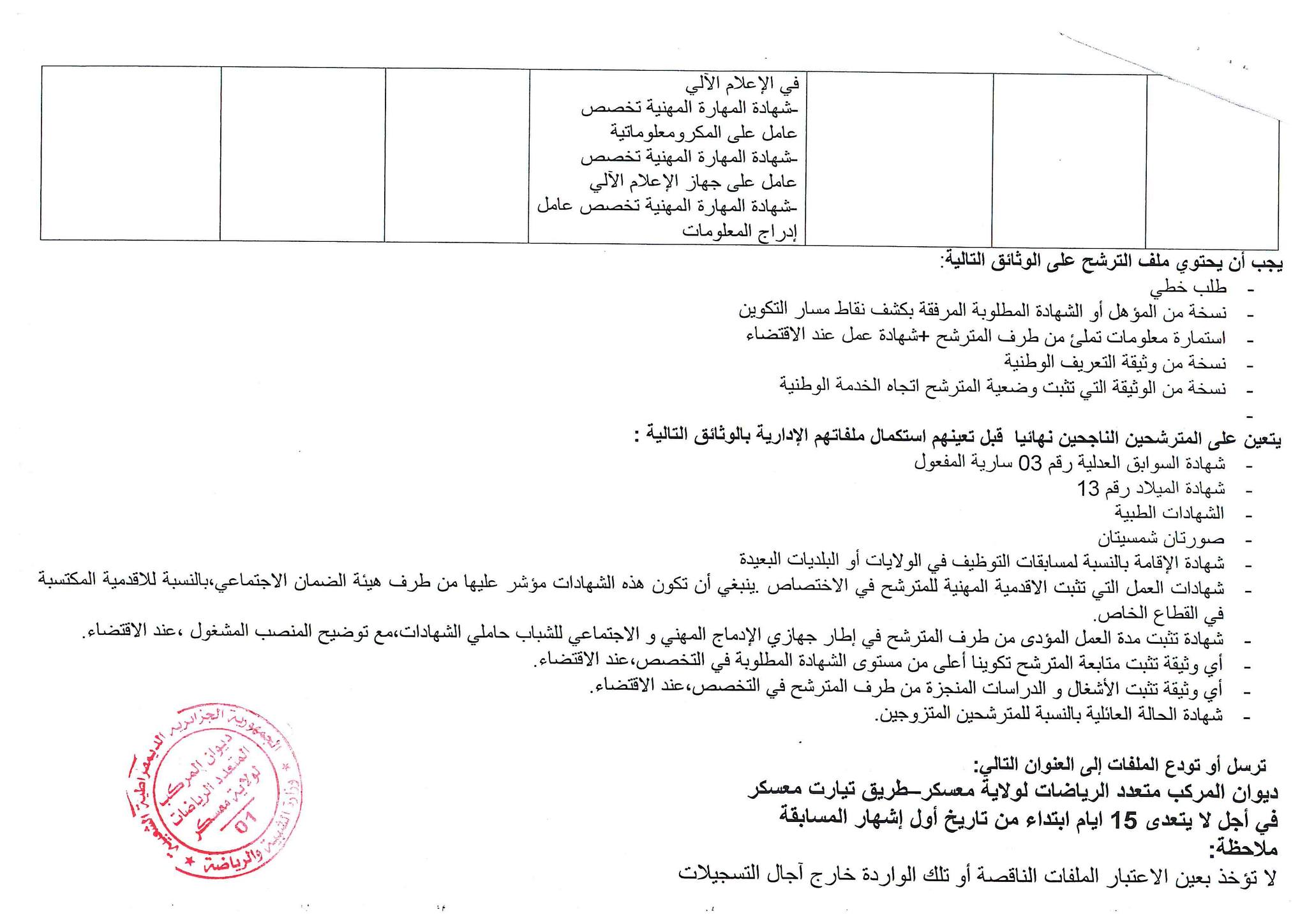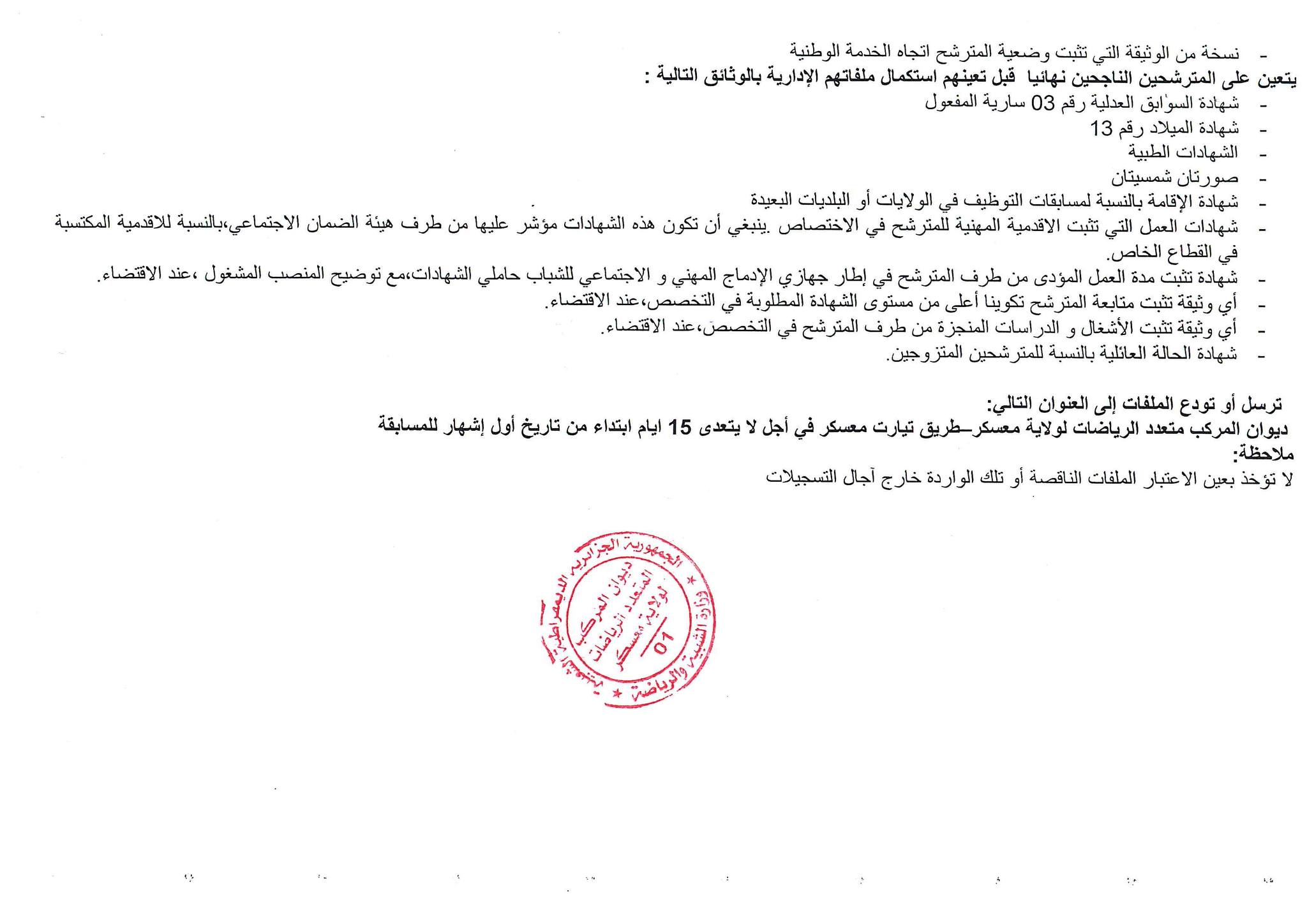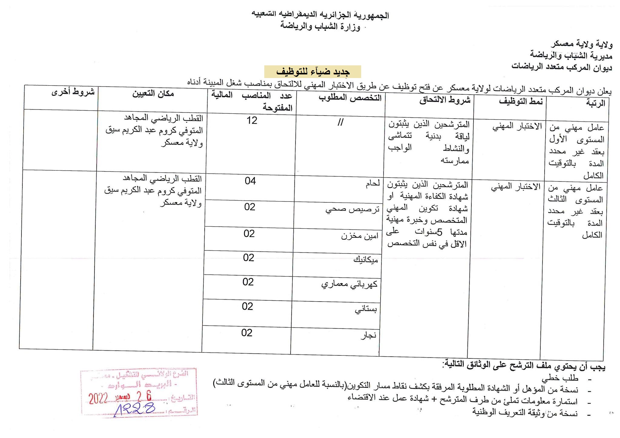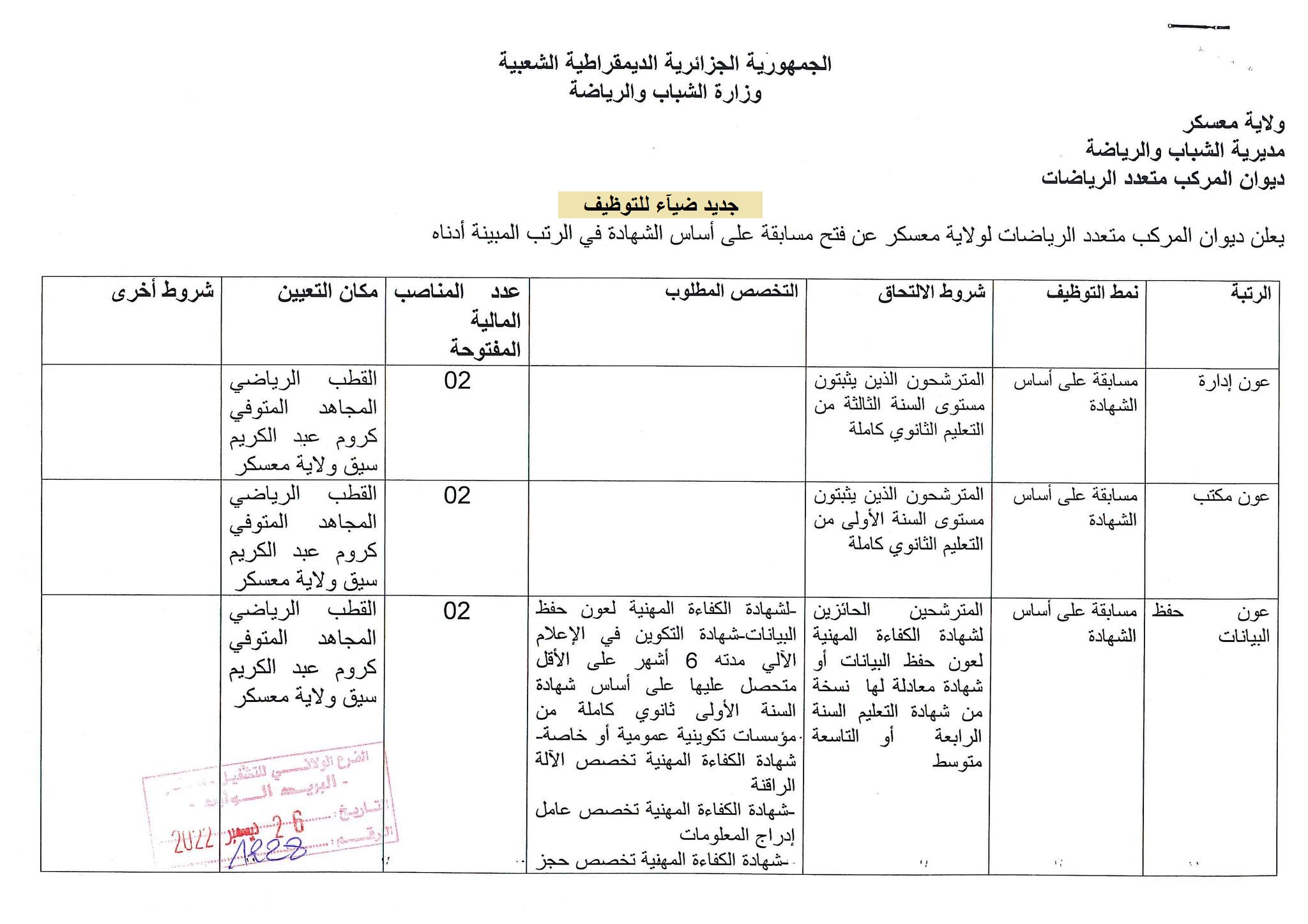 | اعلان عن توظيف بديوان المركب المتعدد الرياضات بولاية معسكر |