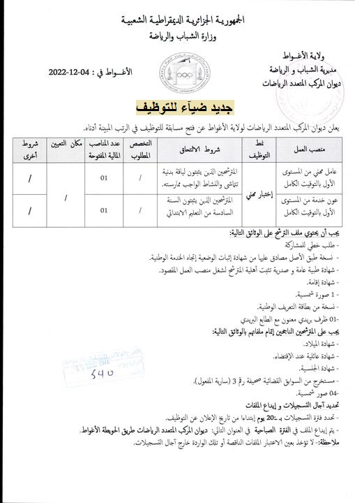 اعلان عن توظيف بديوان المركب المتعدد الرياضات بولاية الاغواط