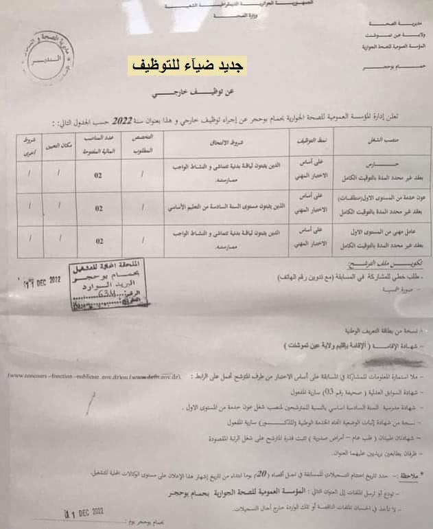 اعلان عن توظيف بالمؤسسة العمومية للصحة الجوارية بحمام الحجر بولاية عين تموشنت