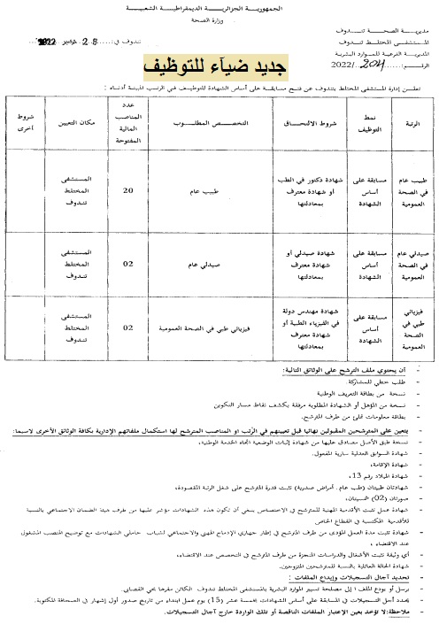 اعلان عن توظيف بالمستشفى المختلط بولاية تندوف