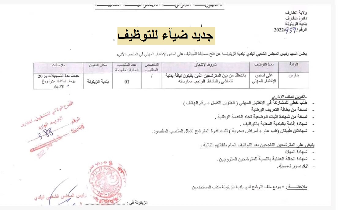 اعلان عن توظيف ببلدية الزيتونة بولاية الطارف