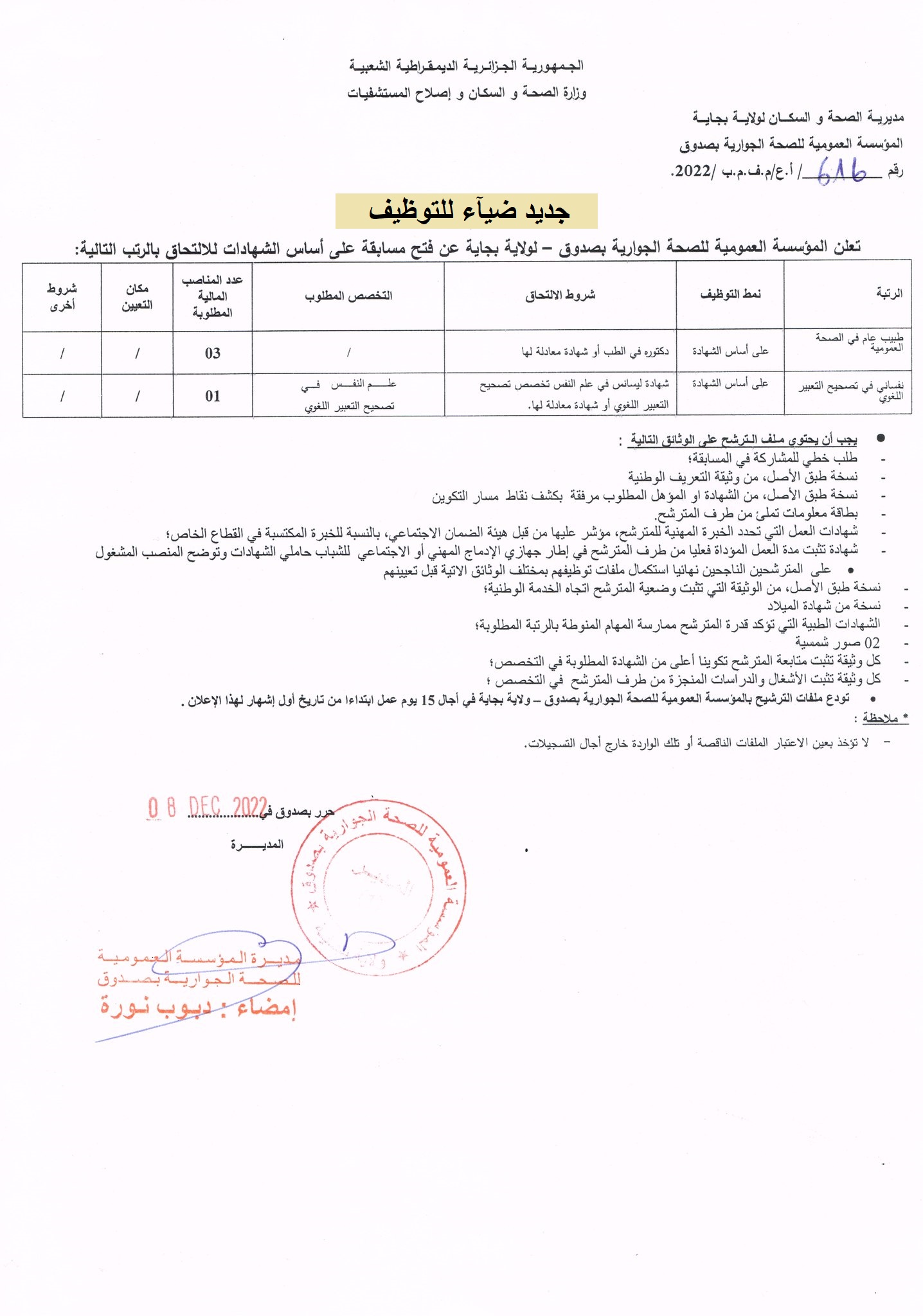 اعلان عن توظيف بالمؤسسة العمومية للصحة الجوارية بصدوق بولاية بجاية