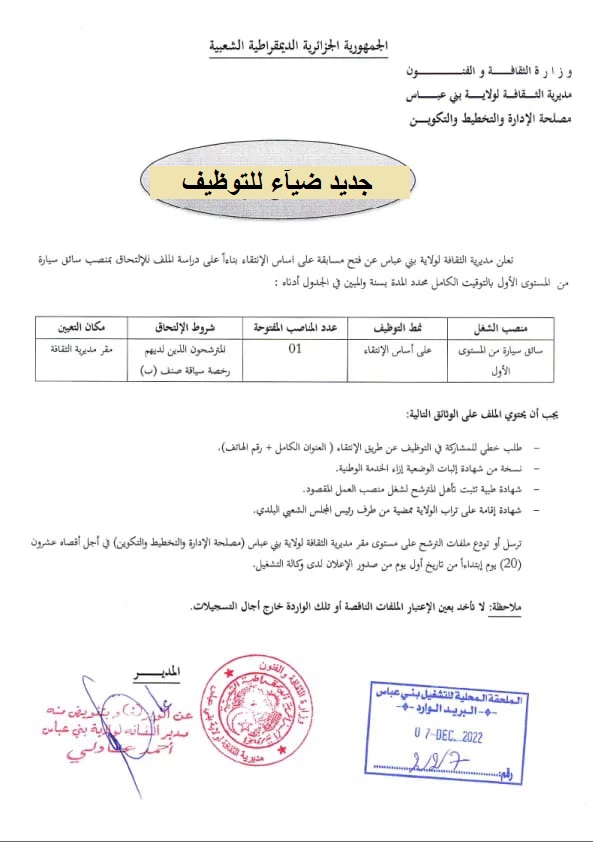 اعلان عن توظيف بمديرية الثقافة لولاية بني عباس