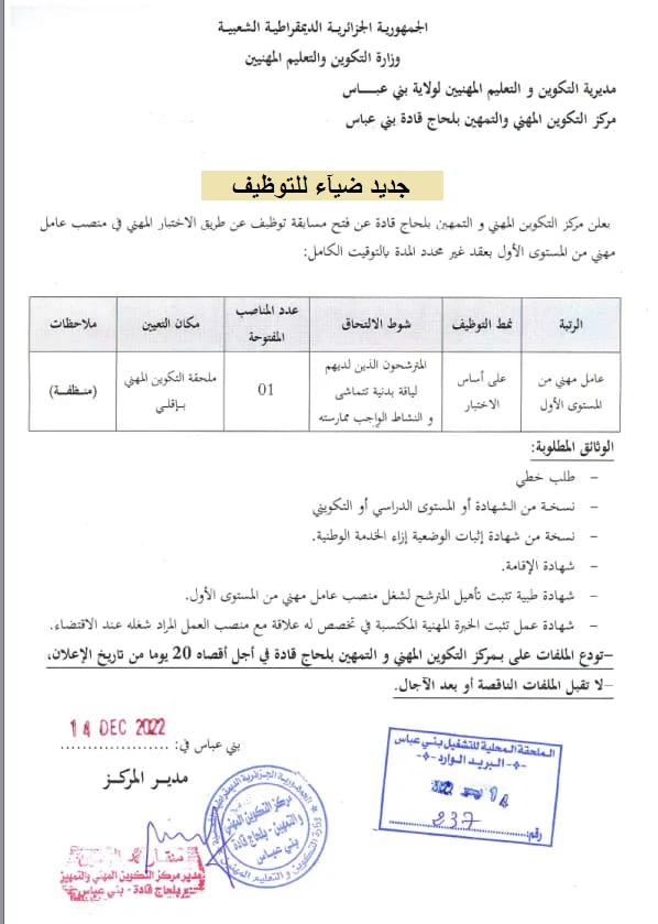اعلان عن توظيف بمركز التكوين المهني والتمهين بلحاج قادة بولاية بني عباس