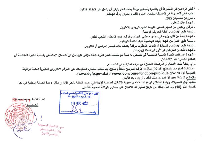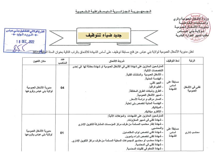 | اعلان عن توظيف بمديرية الاشغال العمومية لولاية بني عباس |