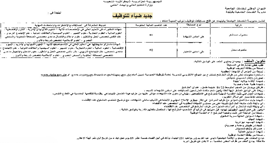 تعلن مديرية الخدمات الجامعية بولاية البليدة مسابقة على أساس الشهادة للتوظيف في الرتب المبينة أدناه: