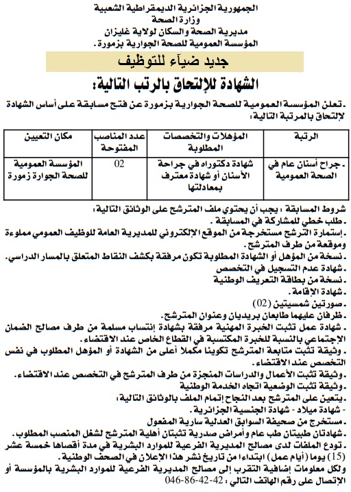 اعلان عن توظيف بالمؤسسة العمومية للصحة الجوارية بزمورة بولاية غليزان