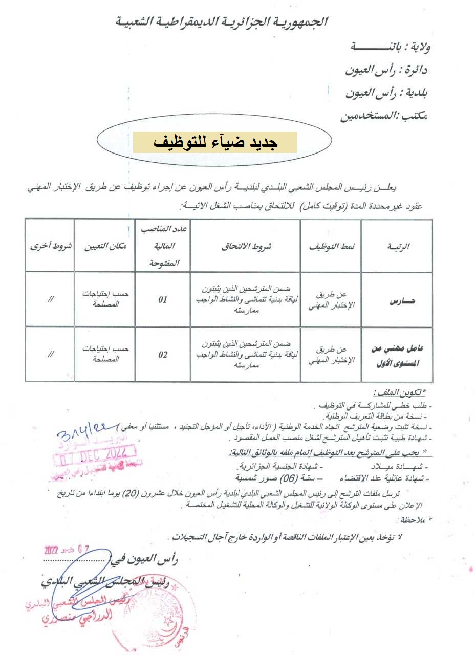 اعلان عن توظيف ببلدية رأس العيون بولاية باتنة
