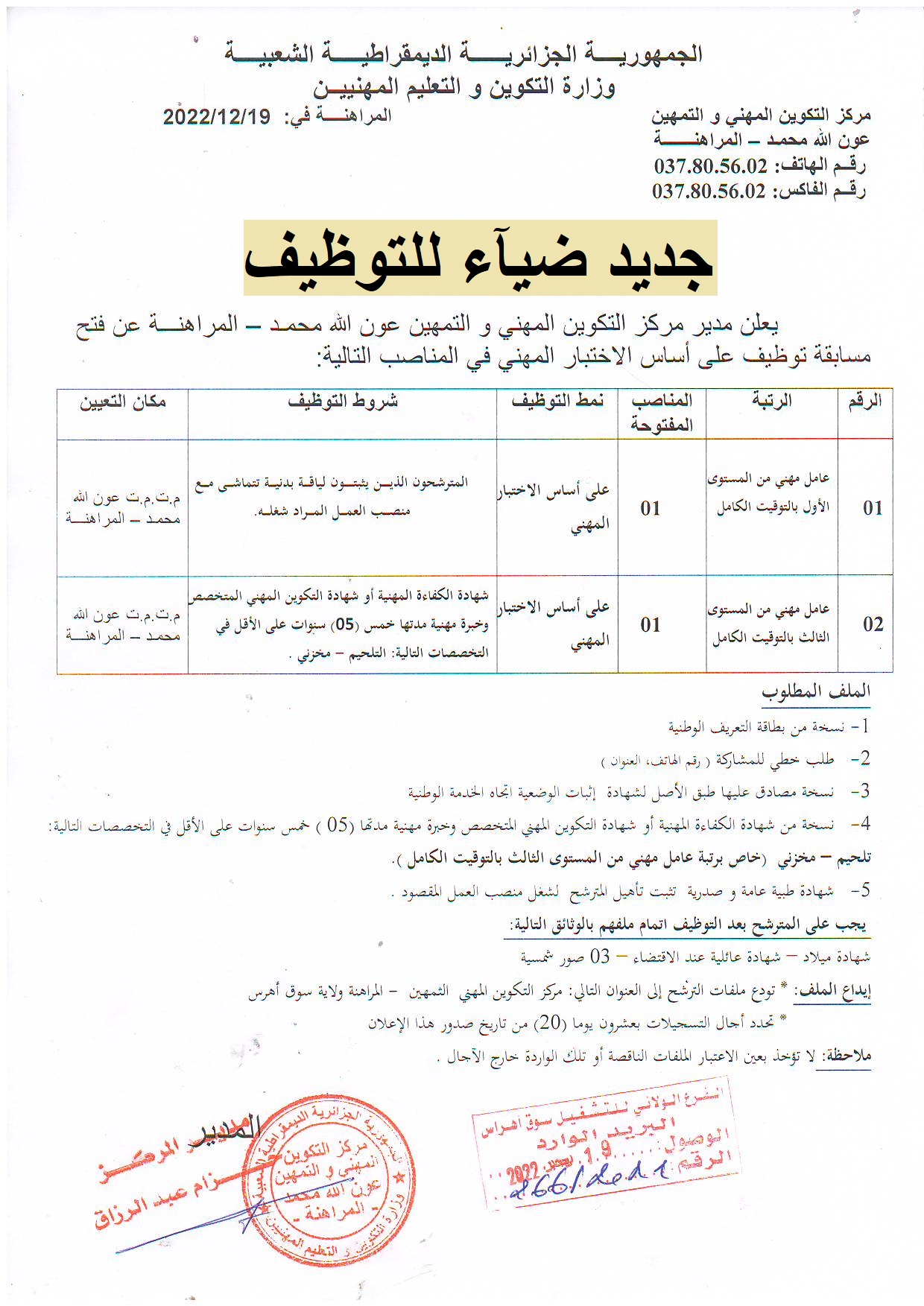 اعلان عن توظيف بمركز التكوين المهني والتمهين عون الله محمد بالمراهنة بولاية سوق اهراس