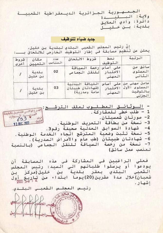 | اعلان عن توظيف ببلدية بن خليل بولاية البليدة |
