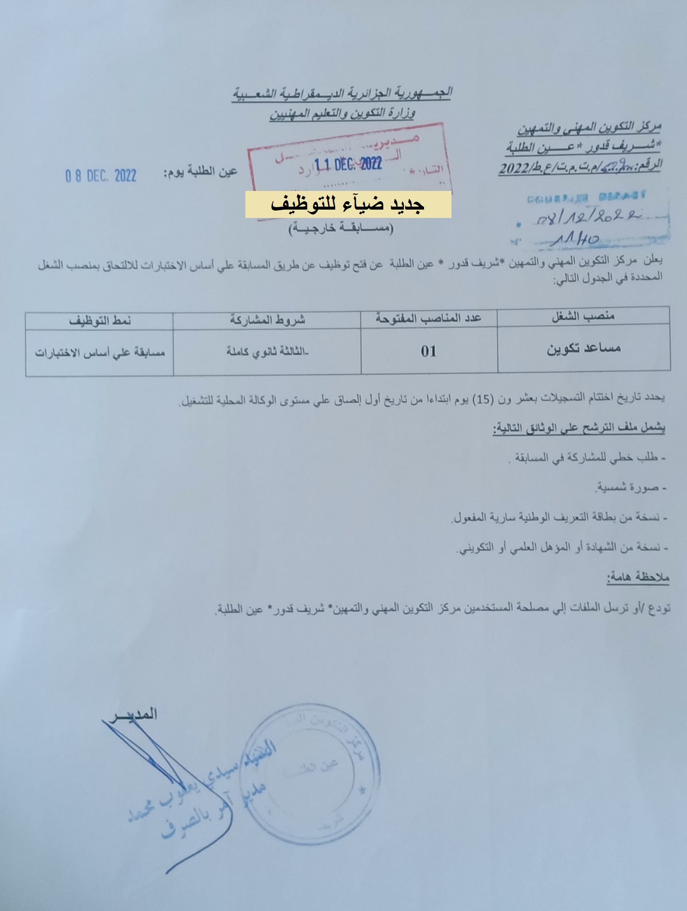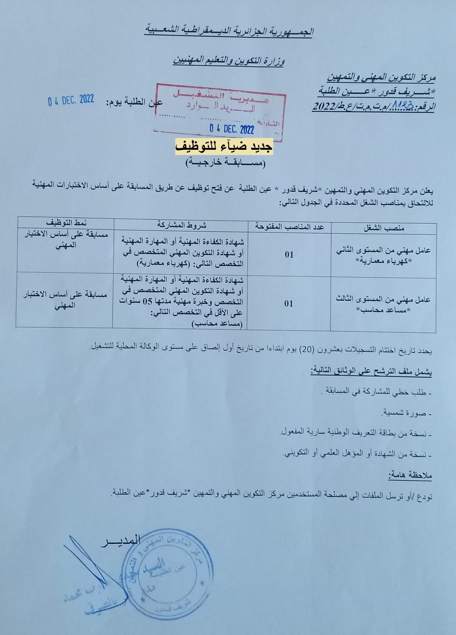 | اعلان عن توظيف بمركز التكوين المهني والتمهين شريف قدور بعين الطلبة بولاية عين تموشنت |