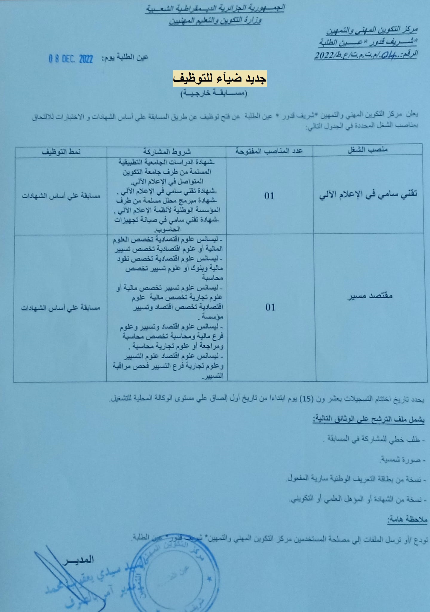 يعلن مركز التكوين المهني والتمهين للفنون بعين الطلبة بولاية عين تموشنت عن فتح مسابقة على أساس الشهادات والاختبارات للتوظيف في الرتب المبينة أدناه:
