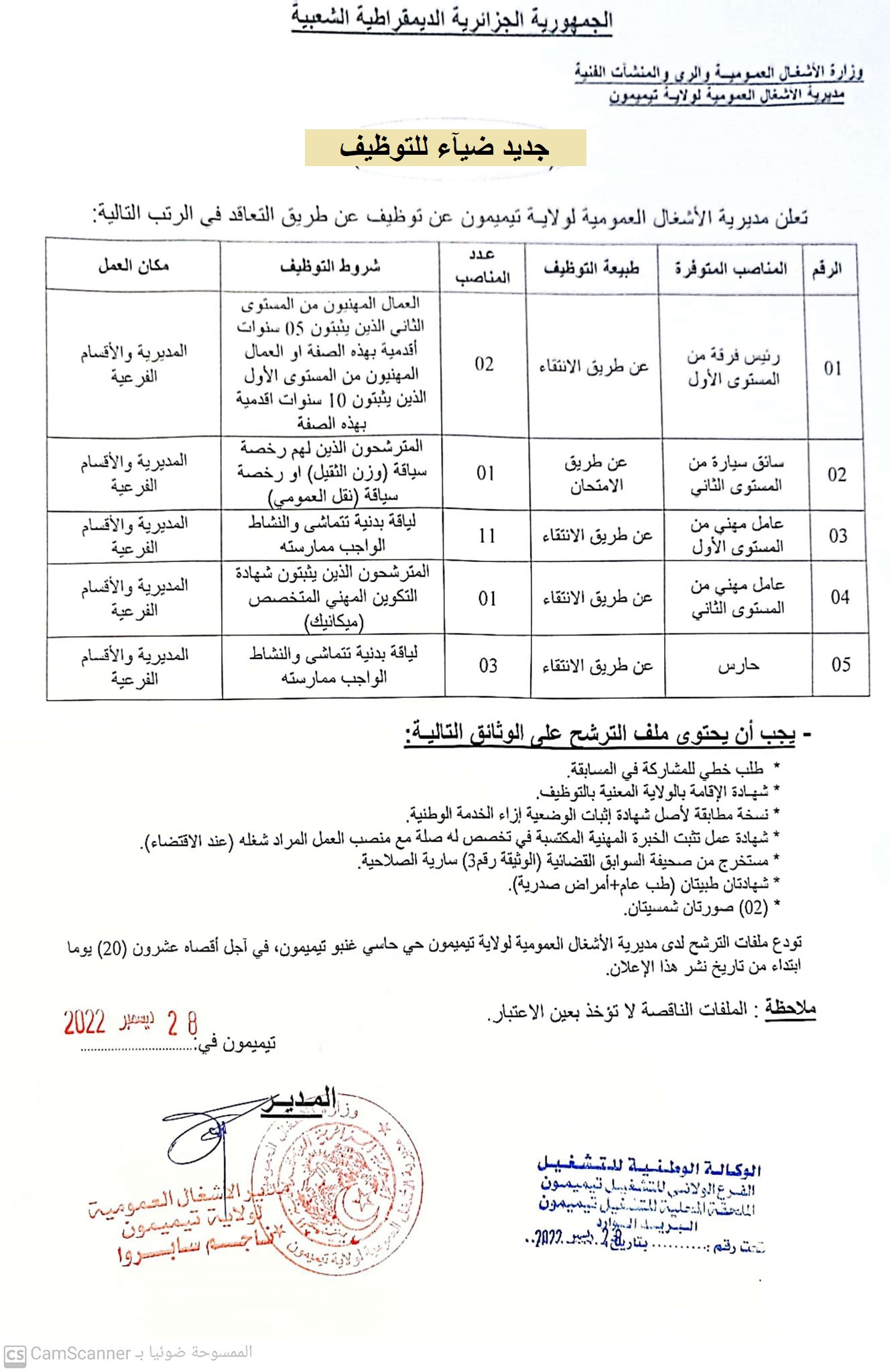 اعلان عن توظيف بمديرية الاشغال العمومية لولاية تيميمون