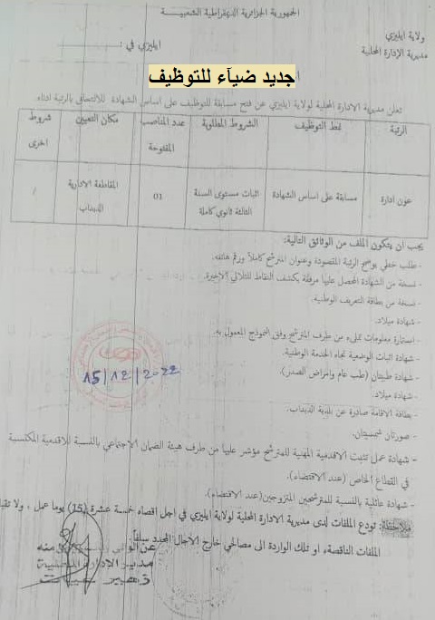 اعلان عن توظيف بمديرية الإدارة المحلية بولاية اليزي