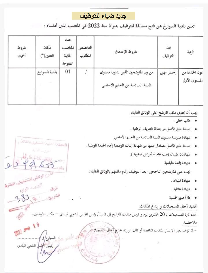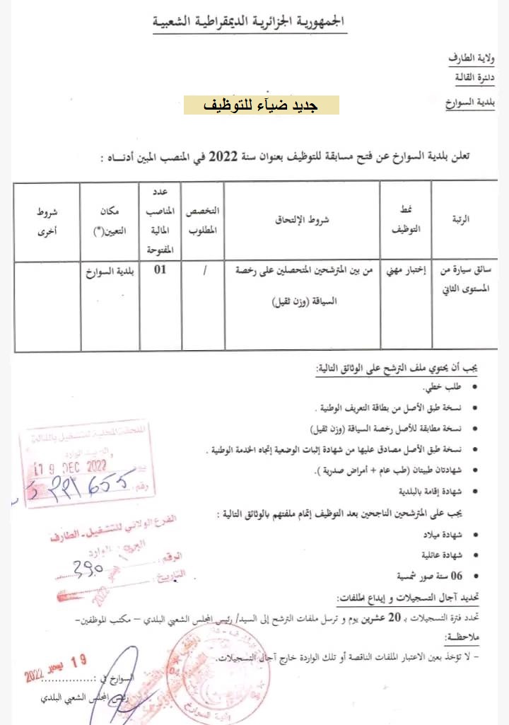 | اعلان عن توظيف ببلدية السوارخ بولاية الطارف |