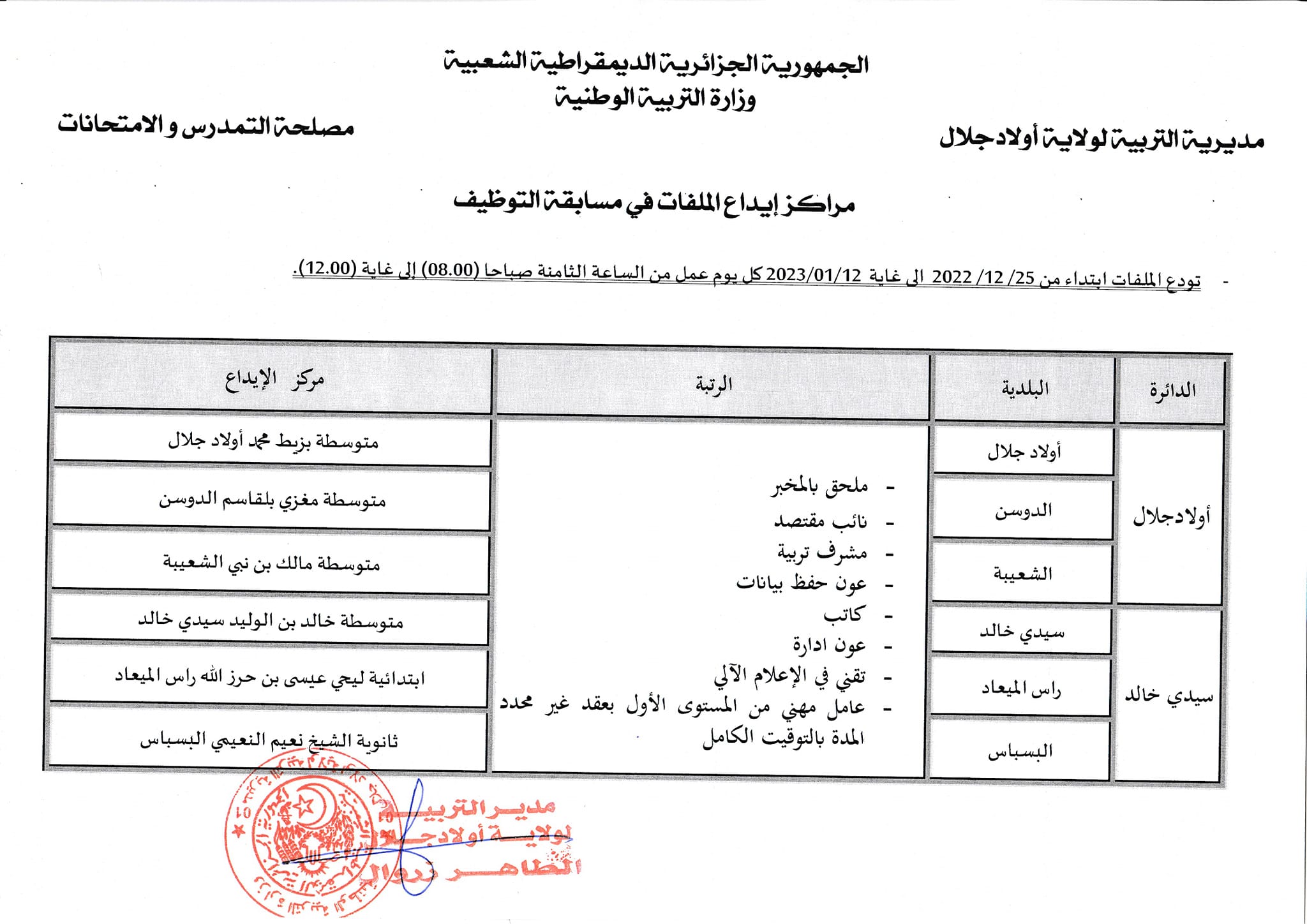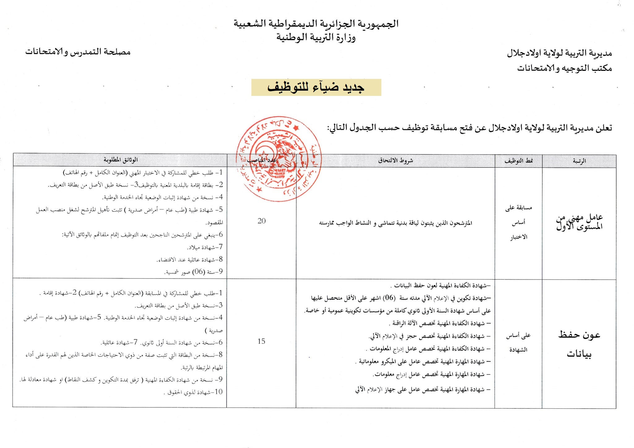 | اعلان عن توظيف بمديرية التربية لولاية أولاد جلال |