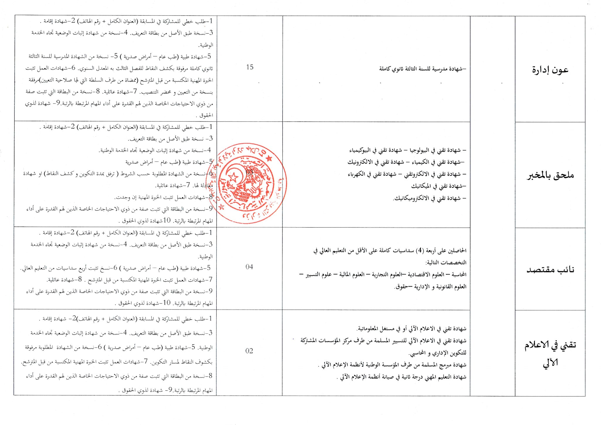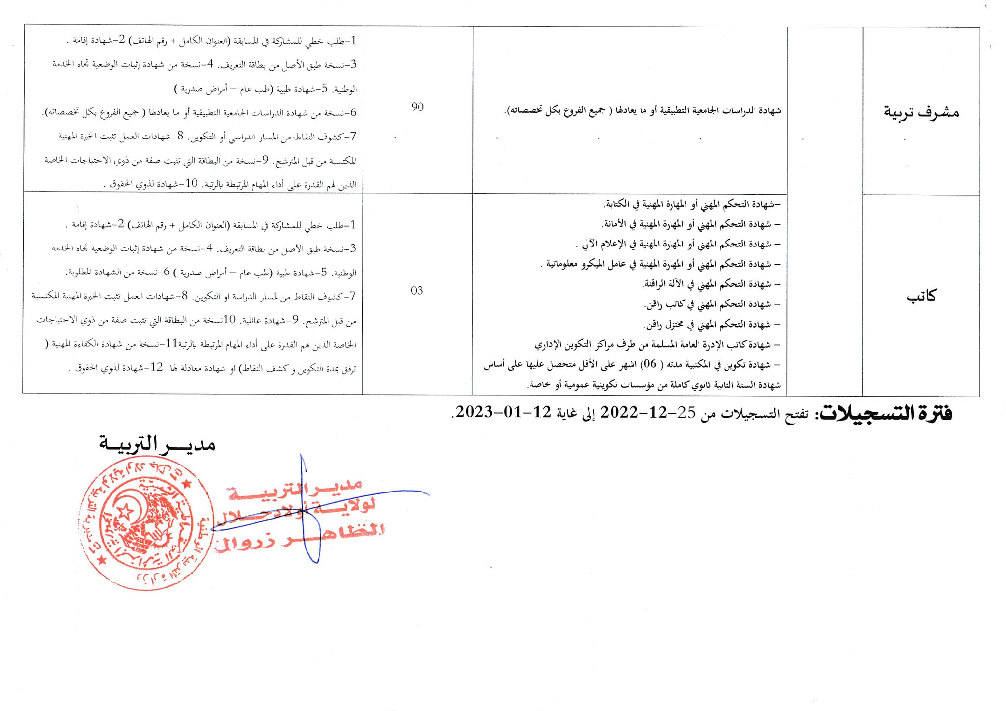 تعلن مديرية التربية لولاية أولاد جلال عن فتح مسابقة على أساس الشهادة و الاختبار المهني للتوظيف في الرتب المبينة أدناه: