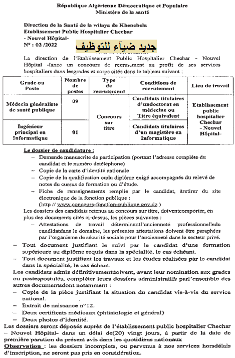 اعلان عن توظيف بالمؤسسة العمومية الاستشفائية بششار بولاية خنشلة