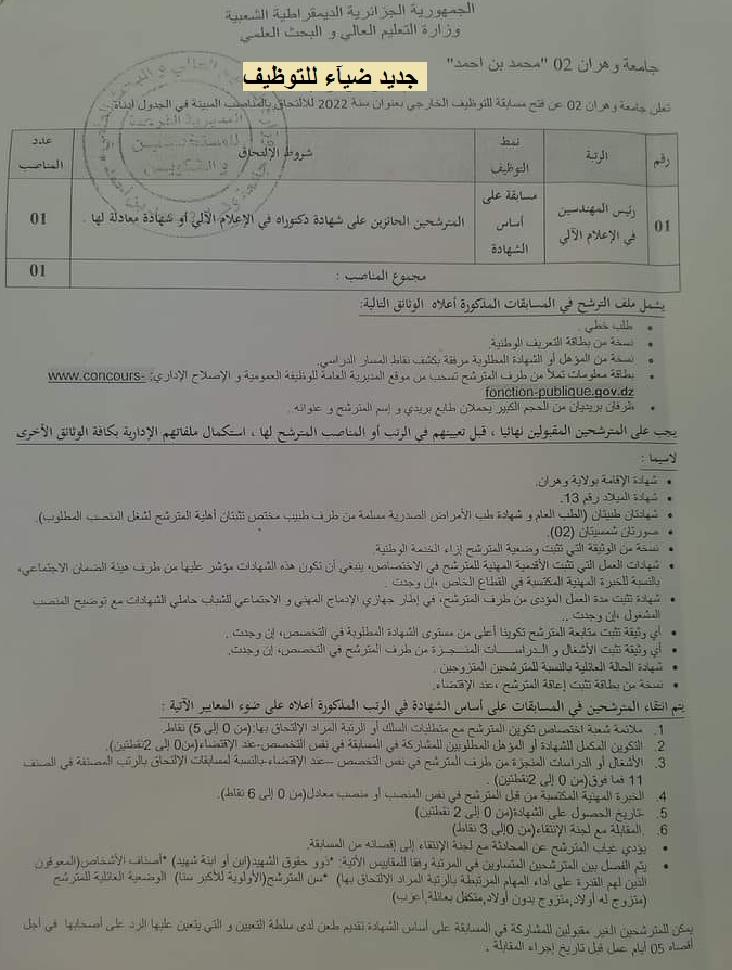 تعلن جامعة محمد بن احمد بولاية وهران عن فتح مسابقة على أساس الشهادة للتوظيف في الرتب المبينة أدناه: